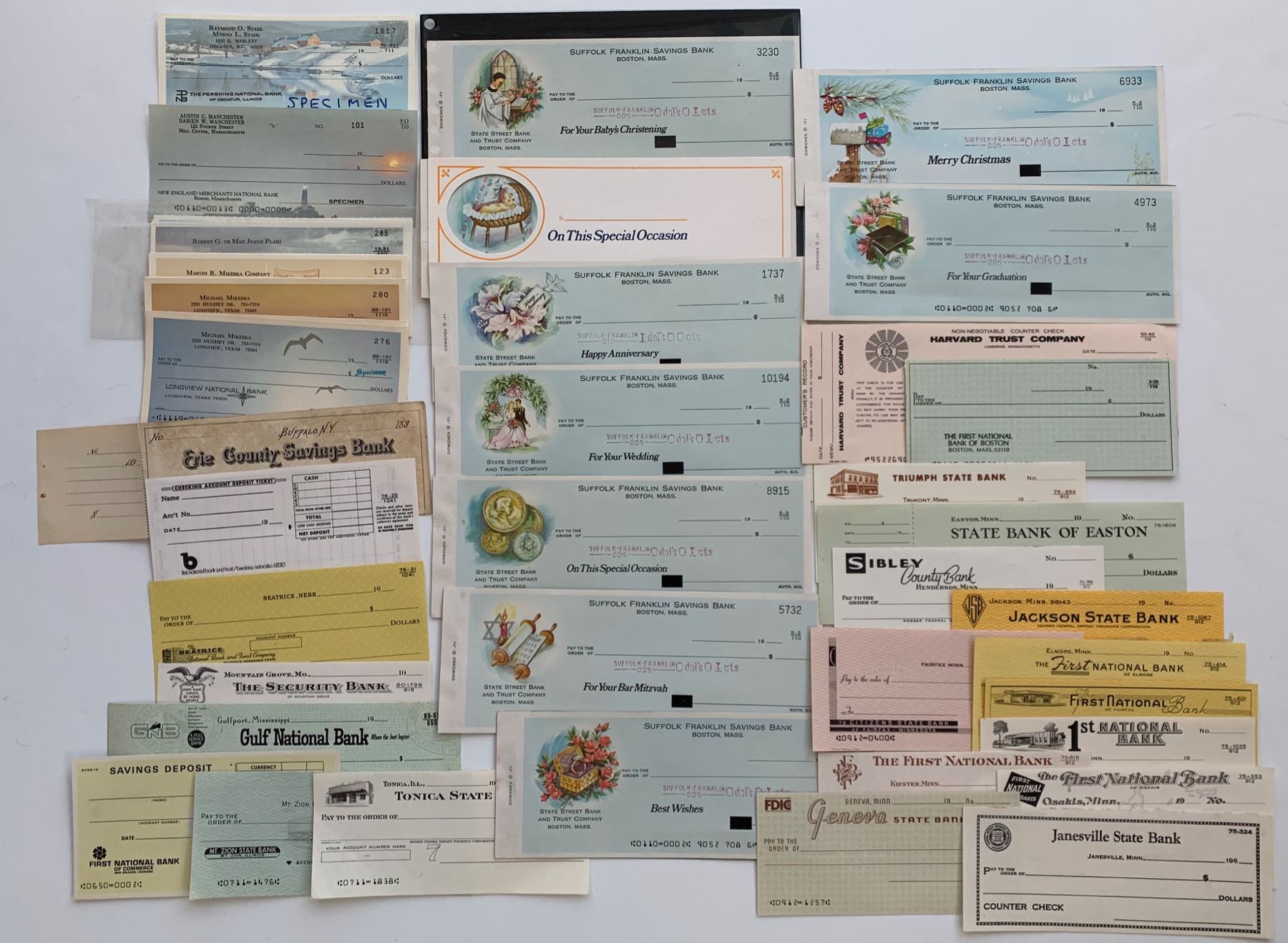 Collections of blank cheques from Texas (48); Tennessee (13); Minnesota (12); Massachusetts (13), Misc. (9), plus 16 blank or specimen personalized cheques. Highlights include ten different special occasion duplicate cheques from Boston, for the sum of one cent, but not otherwise filled in. Again, a generally clean lot without a lot of duplication, and primarily from smaller centres.
