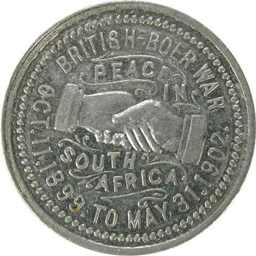 H Falconer, Shelburne, Peace in South Africa, Aluminum, Uncirculated. Reported as being “Scarce, with only 28 struck”
