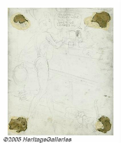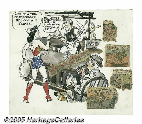 <B>H. G. Peter - Wonder Woman Ordering a Mug of McSorley's Famous Ale Illustration Original Art (circa 1942).</B></I> Wonder Woman uses her magic lasso to compel a chauvinistic bartender to pour her a mug of McSorley's Famous Ale -- apparently these boys were unfamiliar with the concept of "Ladies Night!" As an art bonus, the back of the paper has a light pencil layout sketch of the same scene. The specialty illustration was drawn in ink and watercolor on illustration board, with five panel pieces of a printed <B>Wonder Woman</B></I> comic book collaged onto the piece. The overall size of the piece is 17" x 14.25", and the art is in Excellent condition.