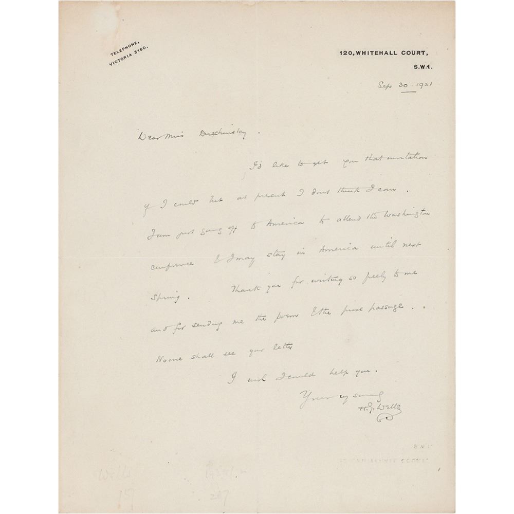 ALS, one page, 7 x 9, 120 Whitehall Court letterhead, September 30, 1921. Handwritten letter to Fran Duschinsky, in full: "I'd like to get you that invitation if I could but at present I don't think I can. I am just going off to America to attend the Washington conference & I may stay in America until next spring. Thank you for writing so freely to me and for sending me the poem & the prose passage. No one shall see your letter. I wish I could help you." In fine condition, with mailing folds.