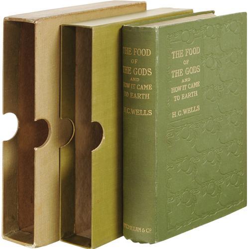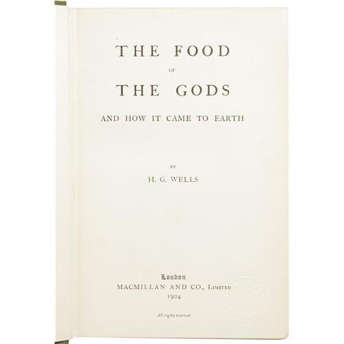 <B>H.G. Wells: Presentation Copy of<I> The Food of the Gods and How It Came to Earth.</B></I></B></I> (London: Macmillan and Company, Ltd., 1904), first edition with gilt top edge, 16 page publisher's catalog bound in back with 20.9.04 date, integral title page with blank verso, 317 pages, green cloth with front cover in gold with blind stamps, publisher's blind stamp "Presentation Copy" on title page, 12mo (5.5" x 7.75"), small morocco leather "Blairhame" bookplate on inside front cover, else near fine with foxing to prelims and slightly bumped corners. A solid copy in beautiful condition housed in a custom cloth double slipcase. <I>From the Ventura Collection.</B></I><BR><BR><b>Shipping:</b> Books & Catalogs (<a target="_blank" href="http://www.heritageauctions.com/common/shipping.php">view shipping information</a>)