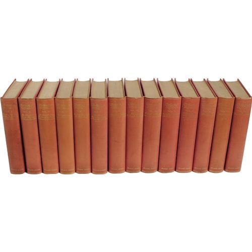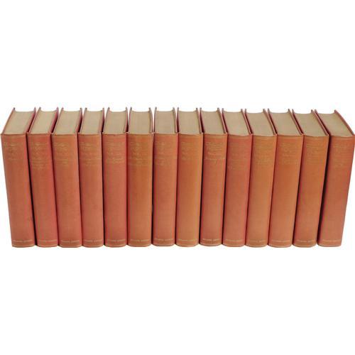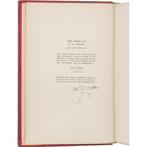 <B>H. G. Wells:<I> The Works of H. G. Wells</B></I></B></I> (London: T. Fisher Unwin, Ltd. New York: Charles Scribner's Sons , 1924-27), Atlantic Edition, number 573 of 1,050 limited numbered sets, 28 volumes, signed by the author on a special limitation page bound in front of volume one, beveled red cloth boards with gilt titles and decoration, gilt top edge, rough cut pages, 8vo (6.5" x 9.25"), all spines faded, some shelf wear to boards, former owner's book plate on the inside front cover of each volume, else very good condition. The complete works of Wells in an attractive binding. <I>From the Ventura Collection.</B></I><BR><BR><b>Shipping:</b> Books & Catalogs (<a target="_blank" href="http://www.heritageauctions.com/common/shipping.php">view shipping information</a>)