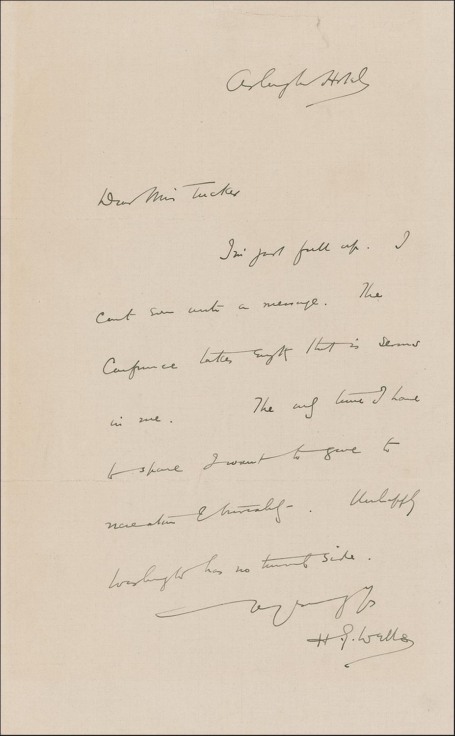 Eminent British writer (1866–1946) who pioneered the science fiction genre with such classic novels as The Time Machine, War of the Worlds, and The Invisible Man. ALS, one page, 5.5 x 9, no date. In haste, Wells sends a letter to Mrs. Tucker from the Arlington Hotel in Washington, D. C. where he was staying while attending the 1921-1922 Washington Naval Conference on disarmament. In part: “I’m just full up. I can’t even write a message…The only time I have to spare I want to give to recreation.” Scattered wrinkling at the top of the page, a tiny tear at the top border, and a light, large block of uniform toning covering most of the page, otherwise fine condition. A bold signature from the brilliant author.