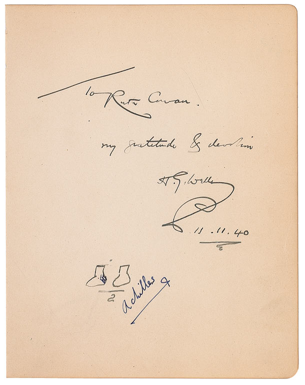 Vintage fountain pen signature and inscription, “To Ruth Cowan, my gratitude & devotion, H. G. Wells, 11-11-40,” on an off-white 4.5 x 5.75 album page. Wells also adds a small sketch of two feet, with the heel of the left foot colored in another pen, adding the word “Achilles.” In fine condition, with very light surface creasing, and a uniform shade of toning, with heavier areas along the edges.