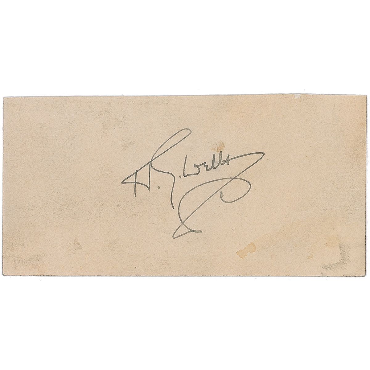Vintage ink signature, “H. G. Wells,” on an off-white 4 x 2 card. Scattered light soiling and rubbing, mounting remnants to the reverse, and a trimmed top edge, none of which detract from Wells’ expressive and unique signature, otherwise fine condition.
