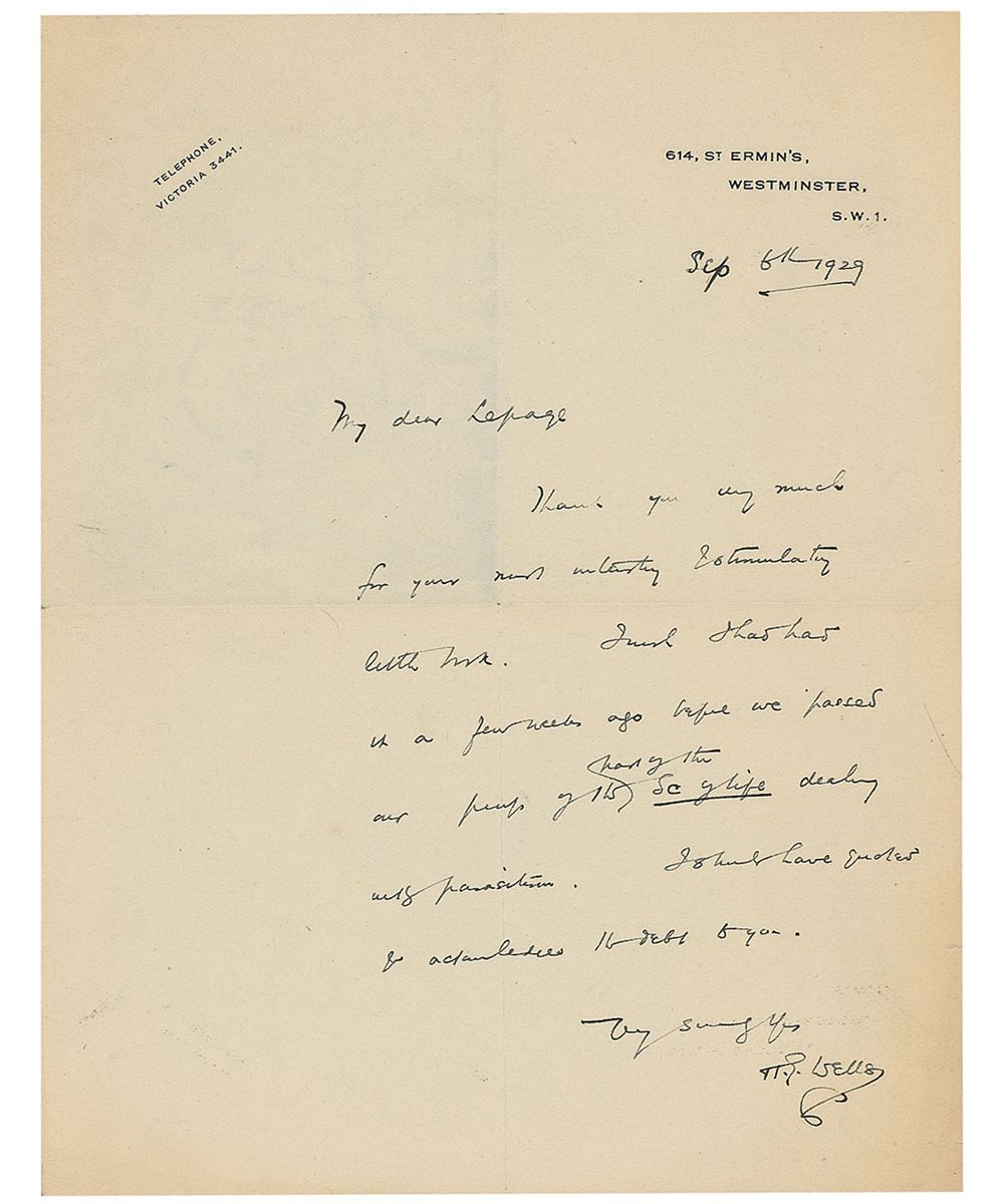 Eminent British writer (1866–1946) who pioneered the science fiction genre with such classic novels as The Time Machine, War of the Worlds, and The Invisible Man. ALS, one page, 7 x 9, personal letterhead, September 6, 1929. Letter to Lepage. In part: “Thank you very much for your most interesting and stimulating letter…I wish I had had it a few weeks ago…I should have quoted and acknowledged the debt to you.” Central horizontal and vertical folds and mild toning to edges, otherwise fine condition.