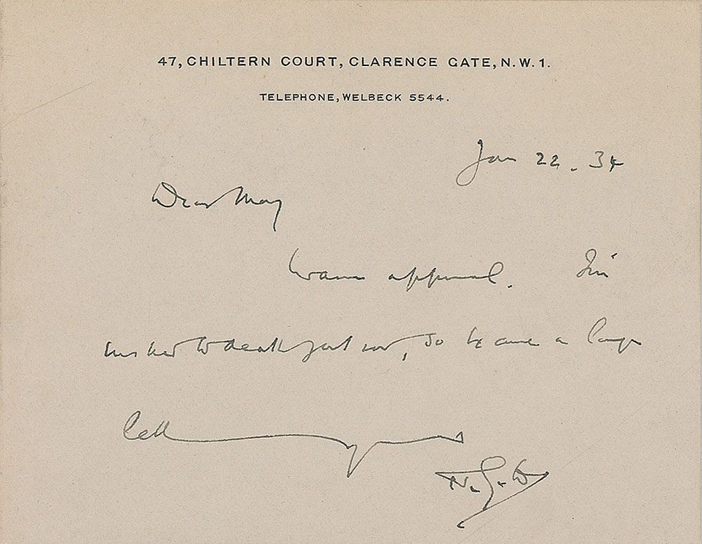 ANS signed “H. G. W.,” one page, 4.5 x 3.5, personal letterhead, January 22, 1934. Brief but humorous note. In full: “Warm approval. I’m worked to death just now, so have a long letter.” In fine condition.