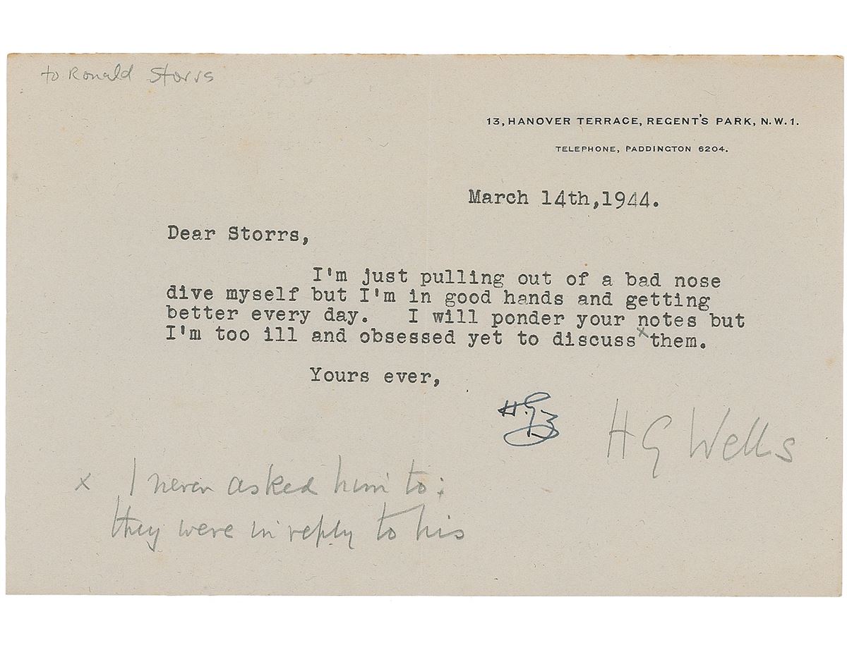 TLS signed “H. G.,” one page, 7 x 4.5, personal letterhead, March 14, 1944. Letter to British official Ronald Storrs. In full: “I’m just pulling out of a bad nose dive myself but I’m in good hands and getting better every day. I will ponder your notes but I’m too ill and obsessed yet to discuss them.” Storrs added a pencil notation at the conclusion concerning the last sentence, “I never asked him to: they were in reply to his.” In fine condition.