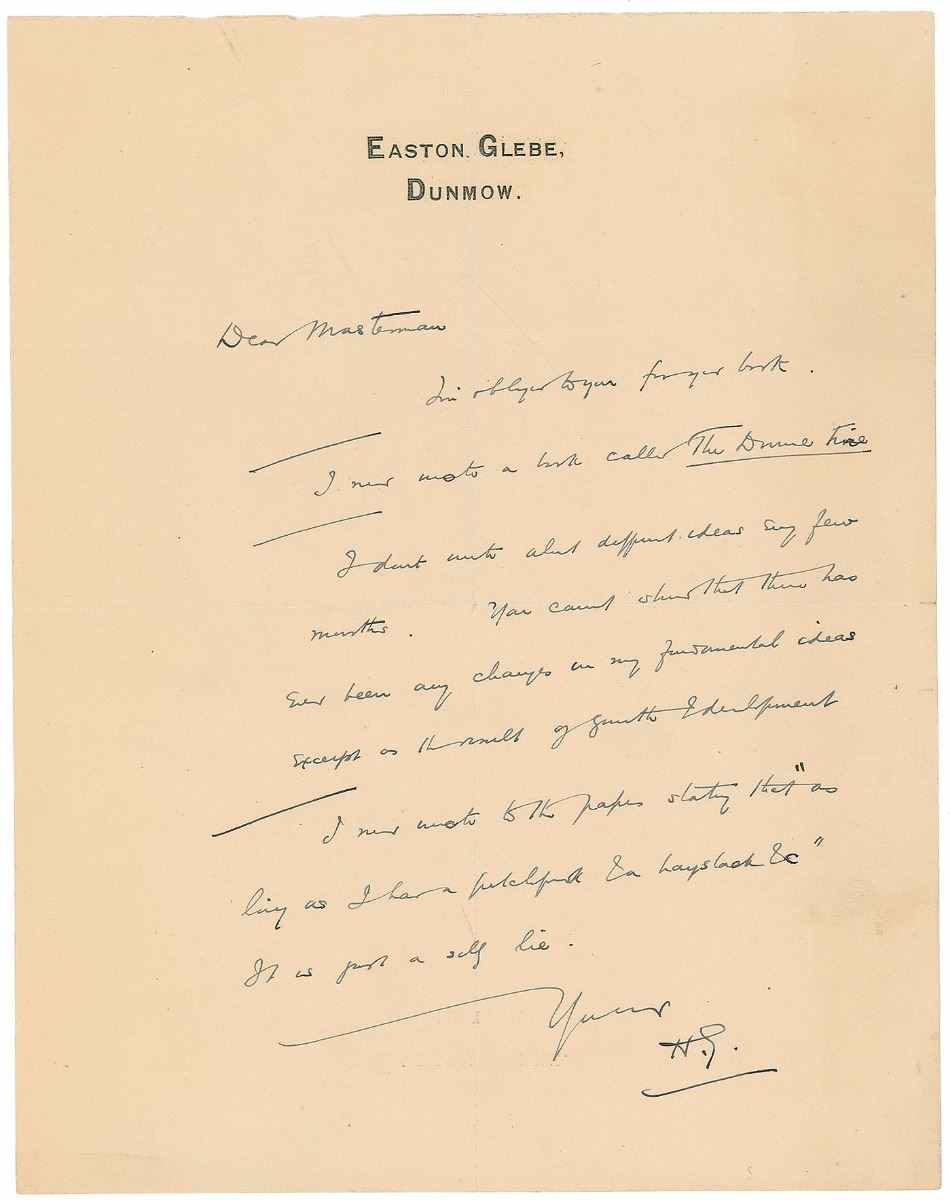 ALS signed “H. G.,” one page, 7 x 8.75, Easton Glebe, Dunmow letterhead, no date. Letter to former head of the British War Propaganda Bureau, Charles Masterman, in part: “You can’t show that there has ever been any change in my fundamental ideas except on…growth & development.” In fine condition, with central vertical and horizontal folds, and slight creasing and toning. During the onset of the first World War, Masterman recruited writers and painters like Wells, Arthur Conan Doyle, and Francis Dodd to support the Allied war effort, sending them to the United States for touring patronage exhibitions designed to encourage America to enter the war and align with British and French forces.