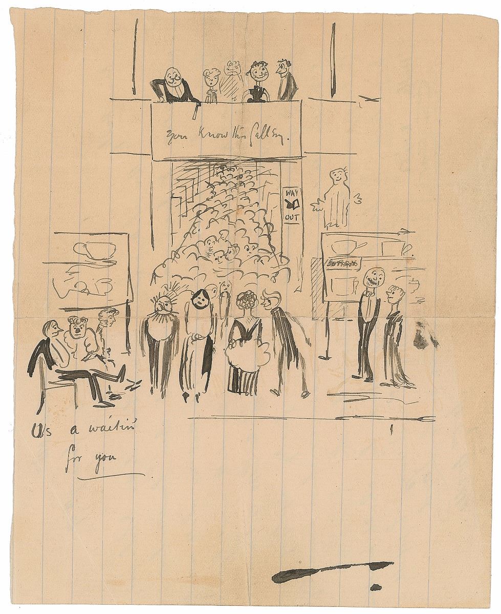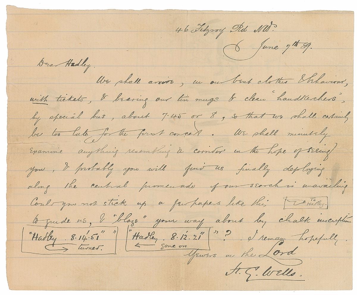 ALS, one page both sides, 6.5 x 5.5, June 7, 1889. Letter to H. E. Hadley. In full: “We shall arrive, in our best clothes & behaviour, with tickets, & bearing our tin mugs & clean ‘handkerchers,’ by special bus, about 7:45 or 8, so that we shall certainly be too late for the first concert. We shall minutely examine anything resembling a corridor in the hope of seeing you, & probably you will find us finally deploying along the central promenade if our search is unavailing. Could you not stick up a few papers like this [To Hadley] to guide us, & ‘blaze’ your way about by chalk inscription?” Wells draws three small directional signs within the text, along with a large, detailed sketch on the reverse showing the interior of a concert hall, captioned below, “Us a waitin’ for you.” Central vertical and horizontal folds with one small edge separation, and light toning and soiling, otherwise fine condition. The pioneering science fiction author was fond of adding sketches and caricatures within his correspondence, little drawings that he called ‘picshuas.’