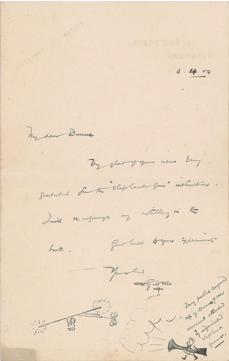 ALS, one page, 4.5 x 7, blindstamped Spade House letterhead, April 6, 1904. Letter to aeronautical engineer John William Dunne, one of his close friends. In full: “Very glad of your news and very grateful for the ‘elephant gun’ instructions. I will rearrange my artillery in the book. Good luck to your experiments.” Wells draws a humorous sketch of a man shooting down an aircraft with an enormous elephant gun, captioned, “Picture conjured up by Dunne of an astronaut attacked by infuriated elephant gunner.” In fine condition, with a small area of toning to lower edge.