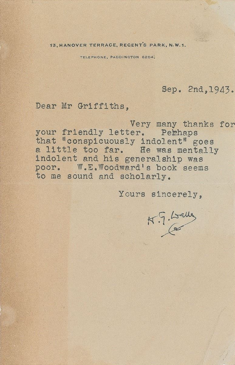 TLS, one page, 4.5 x 7, 13, Hanover Terrace, Regent’s Park letterhead, September 2, 1943. Letter to Eustace B. Griffiths, in full: “Very many thanks for your friendly letter. Perhaps that ‘conspicuously indolent’ goes a little too far. He was mentally indolent and his generalship was poor. W. E. Woodward’s book seems to me sound and scholarly.” In very good condition, with two creased corners, and light irregular toning. Accompanied by the original mailing envelope. Wells is likely referring to Meet General Grant, a 1928 biography of U. S. Grant by Woodward.