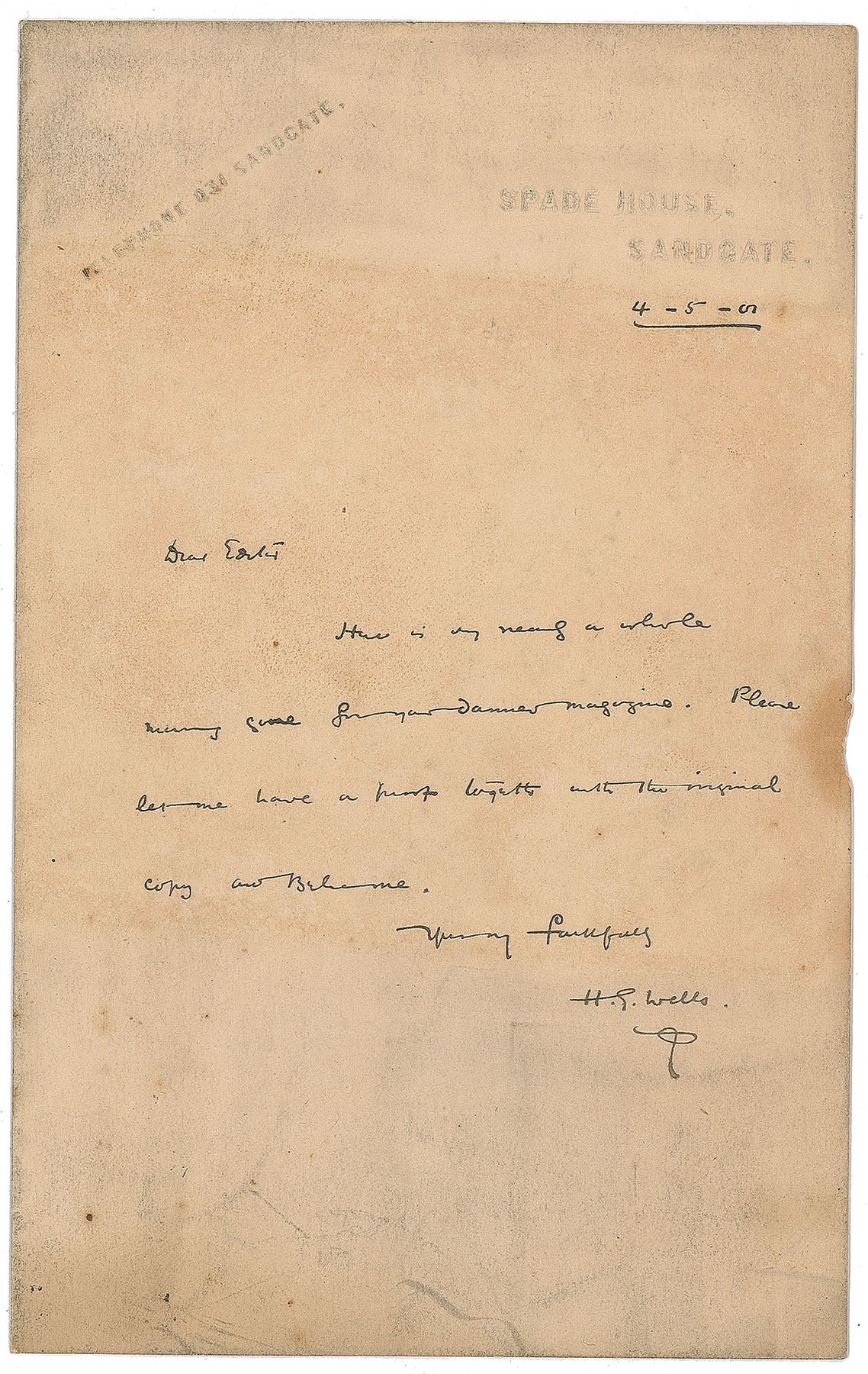 ALS, one page, 4.25 x 7, Spade House, Sandgate letterhead, April 5, 1901. Wells forwards his work to a "damned magazine," in part: "Please let me have a proof together with the original copy and believe me." In very good condition, with moderate overall soiling and a stain to the right edge.