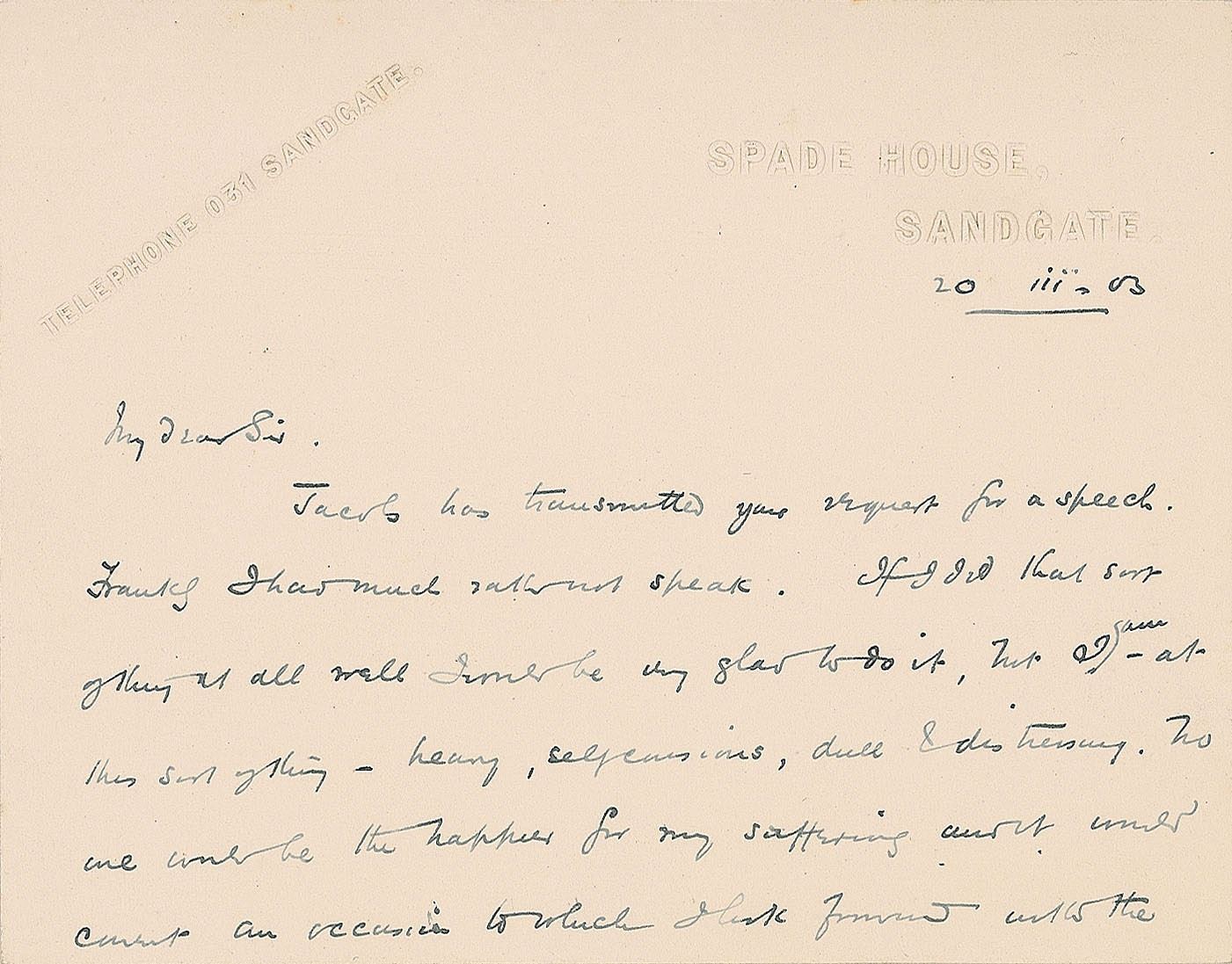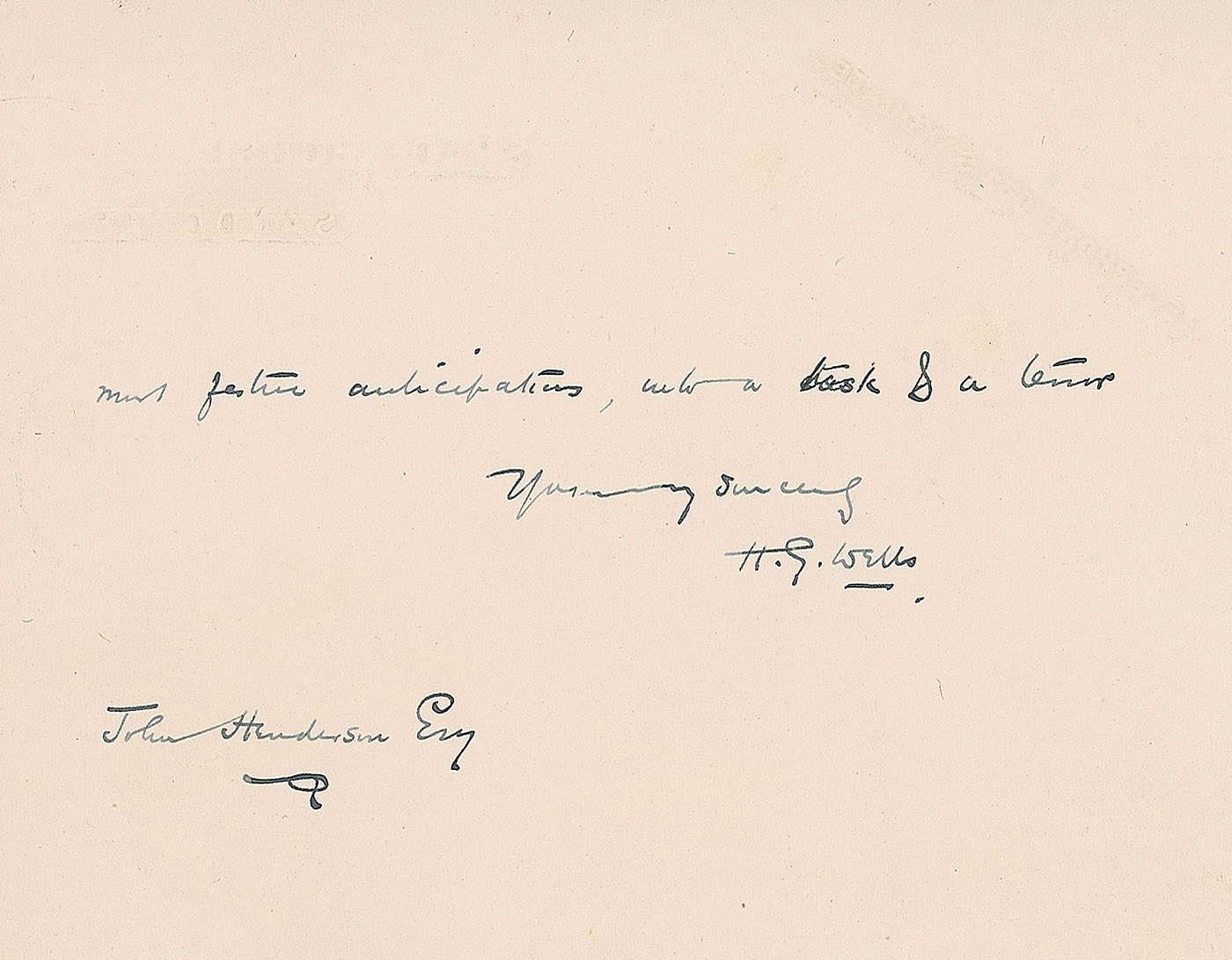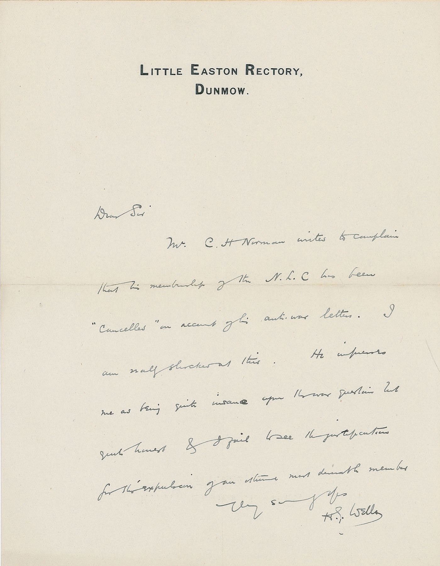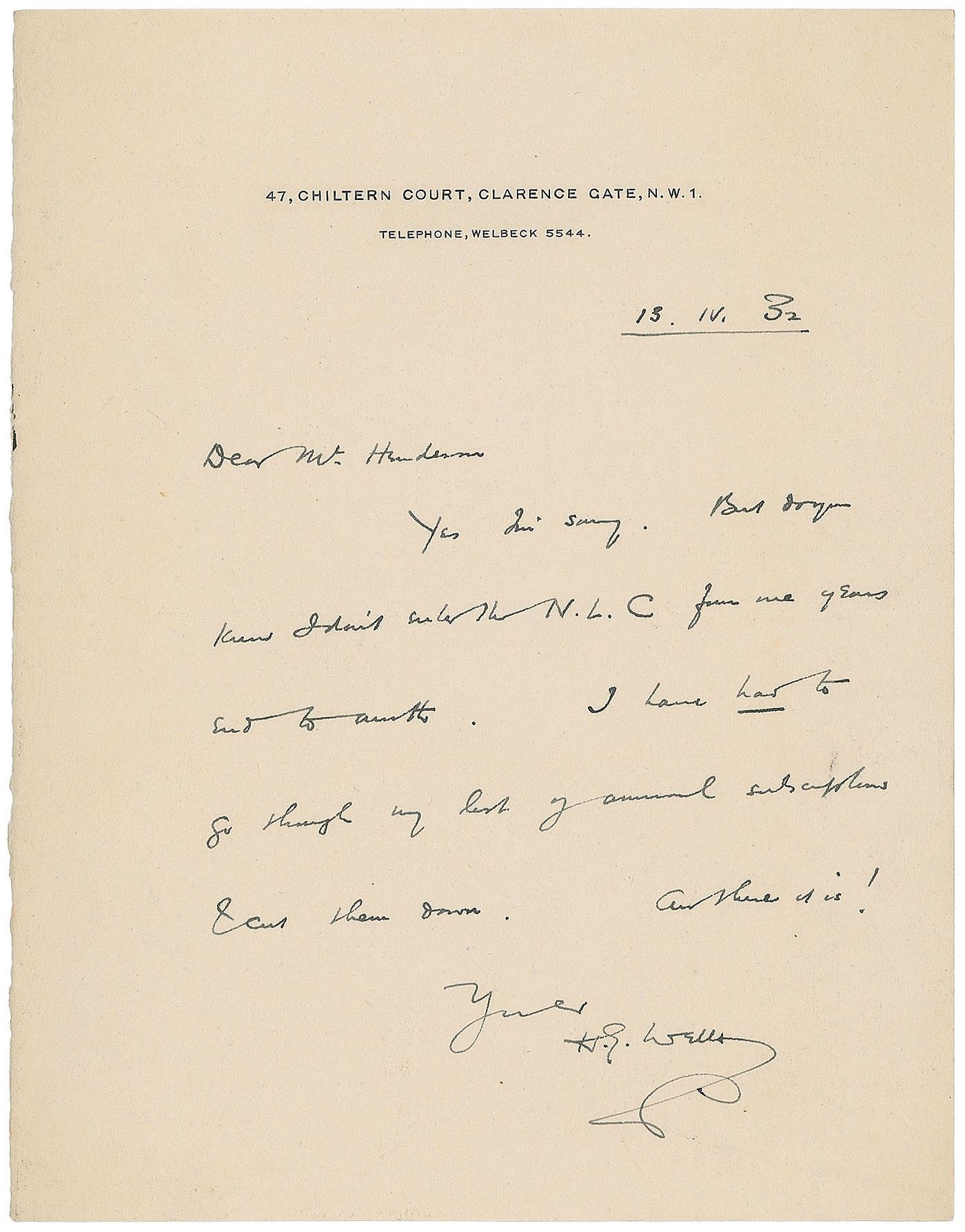 Four ALSs, signed "H. G. Wells," ranging in size from 4.5 x 3.5 to 7 x 9, dated from 1903 to 1932 (two undated). Letters are all to John Henderson, Secretary of the National Liberal Club, regarding invitations, publications, and membership matters. One letter, dated March 20, 1903, in full: "Jacob has transmitted your request for a speech. Frankly I had much rather not speak. If I did that sort of thing at all well I would be very glad to do it, but I am-at this sort of thing-heavy, self-conscious, dull & disinteresting. No one would be the happier for my suffering and it would convert an occasion to which I look forward with the most festive anticipation, into a task and a terror." Another, undated, reads in part: "C[larence] H[enry] Norman writes to complain that his membership of the N.L.C. has been 'cancelled' on account of his anti-war letters. I am half-shocked at this. He impresses me as being quite insane upon the war question but quite honest & I fail to see the justification for this expulsion of an esteemed most desirable member." In overall fine condition.