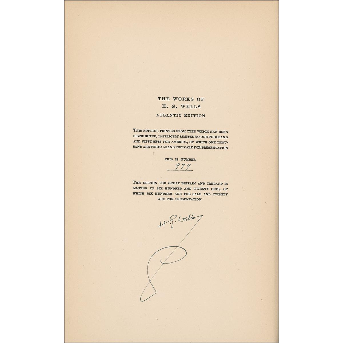 Eminent British writer (1866–1946) who pioneered the science fiction genre with such classic novels as The Time Machine, War of the Worlds, and The Invisible Man. The Works of H.G. Wells, Limited edition Atlantic Edition of 1050 copies (this being No. 979), Volume One. NY: Charles Scribner’s Sons, 1924. Hardcover, 6.25 x 9.25, 467 pages. Signed on the limitations page by Wells. In fine condition, with very mild toning to fore-edges, spine a bit weak, soiling to spine, and toning and edge chipping to spine label. A nice volume which includes The Time Machine, The Wonderful Visit and Other Early Fantastic Stories.