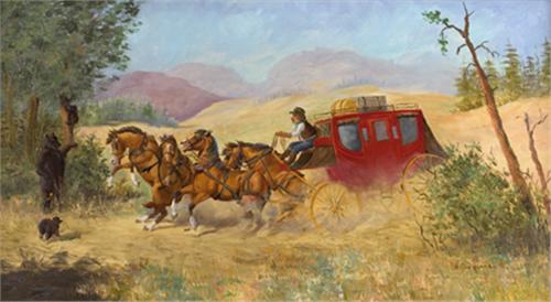 Hildred Goodwine (1918-1998). Unexpected Surprise. 20" x 36" oil on canvas. Signed lower right. (est $500-1000)