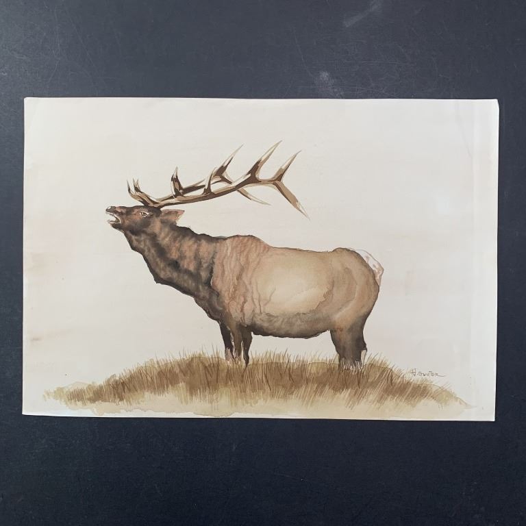 H. Gunter's "Moose Call" original print. This piece is of a profile of a moose, in the middle of a moose call, done in a watercolour style. This piece is in near excellent condition, with a minor crease from top to bottom at right.