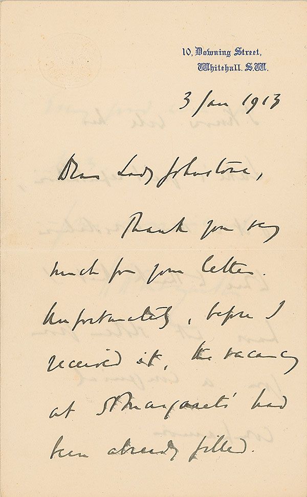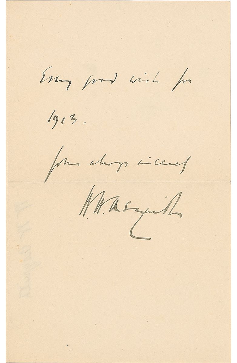 British prime minister from 1908–1916. ALS, three pages on two adjoining sheets, 4.5 x 7.25, Prime Minister letterhead, January 3, 1913. Letter to Lord Johnstone. In part: “Thank you very much for your letter. Unfortunately, before I received it the vacan