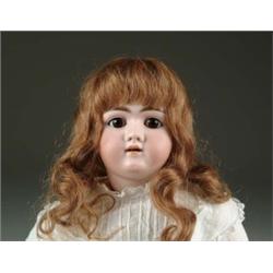H. HANDWERCK 99 OPEN MOUTHED CHILD. A German character child with brown glass sleep eyes, pale bisque & a marked ball-jointed composition body, wearing an antique dress with lace trims and a replacement human hair wig. SIZE: 27”. CONDITION: Overall very fine condition, lower right arm has some repaint, otherwise body near mint. JL 1-4436 (300-500)