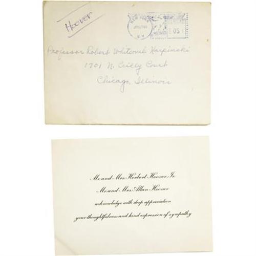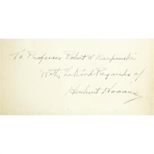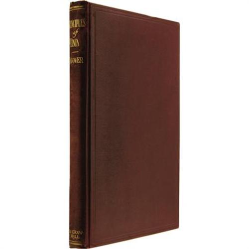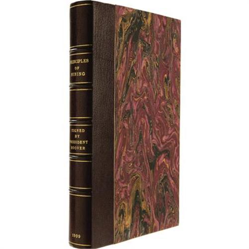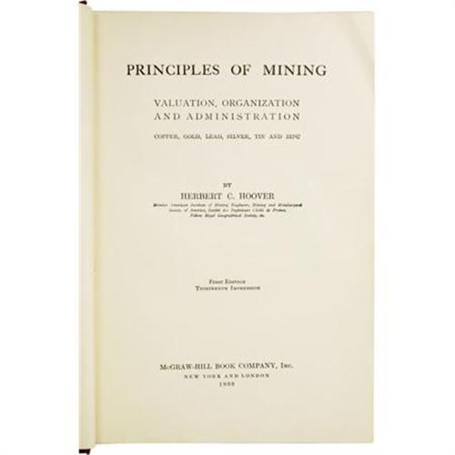 <B>Herbert Hoover: Signed First Edition of <I>Principles of Mining</B></I>.</B></I> (New York and London: McGraw-Hill Book Company, Inc., 1909), first edition, thirteenth impression, 199 pages, crimson cloth binding with gilt lettering on the spine, 8vo (6.25" x 9.25"), clear Mylar dust sleeve. Housed in a custom red quarter leather slipcase with marbled boards, gilt spine titles, and five raised leather spine bands. Inscribed and signed "<I>To Professor Robert W. Karpinski With the Kind Regards of Herbert Hoover</B></I>" on the front free endpaper. Laid-in is a January 13, 1965 response card from Herbert Hoover, Jr. and Allan Hoover, thanking Professor Karpinski for his "sympathy", likely for his condolences at the death of their father, who had passed away the previous fall. Professor Karpinski was a professor of Geology at the University of Illinois at Chicago during the 1960s, a subject near and dear to Hoover's heart. Certainly the two men would have shared a passionate interest in the subject of this very book, which is in very good condition.<BR><BR><b>Shipping:</b> Books & Catalogs (<a target="_blank" href="http://www.heritageauctions.com/common/shipping.php">view shipping information</a>)