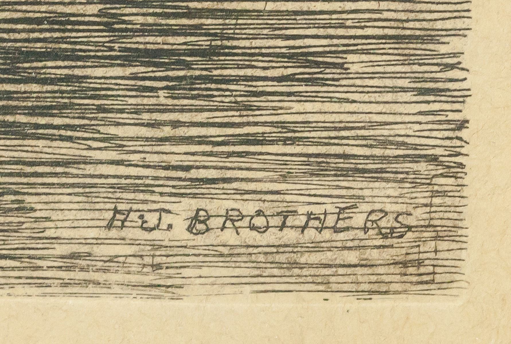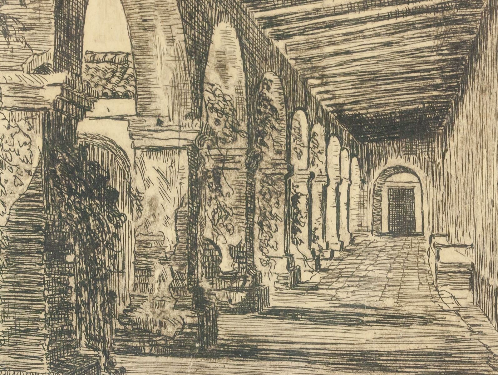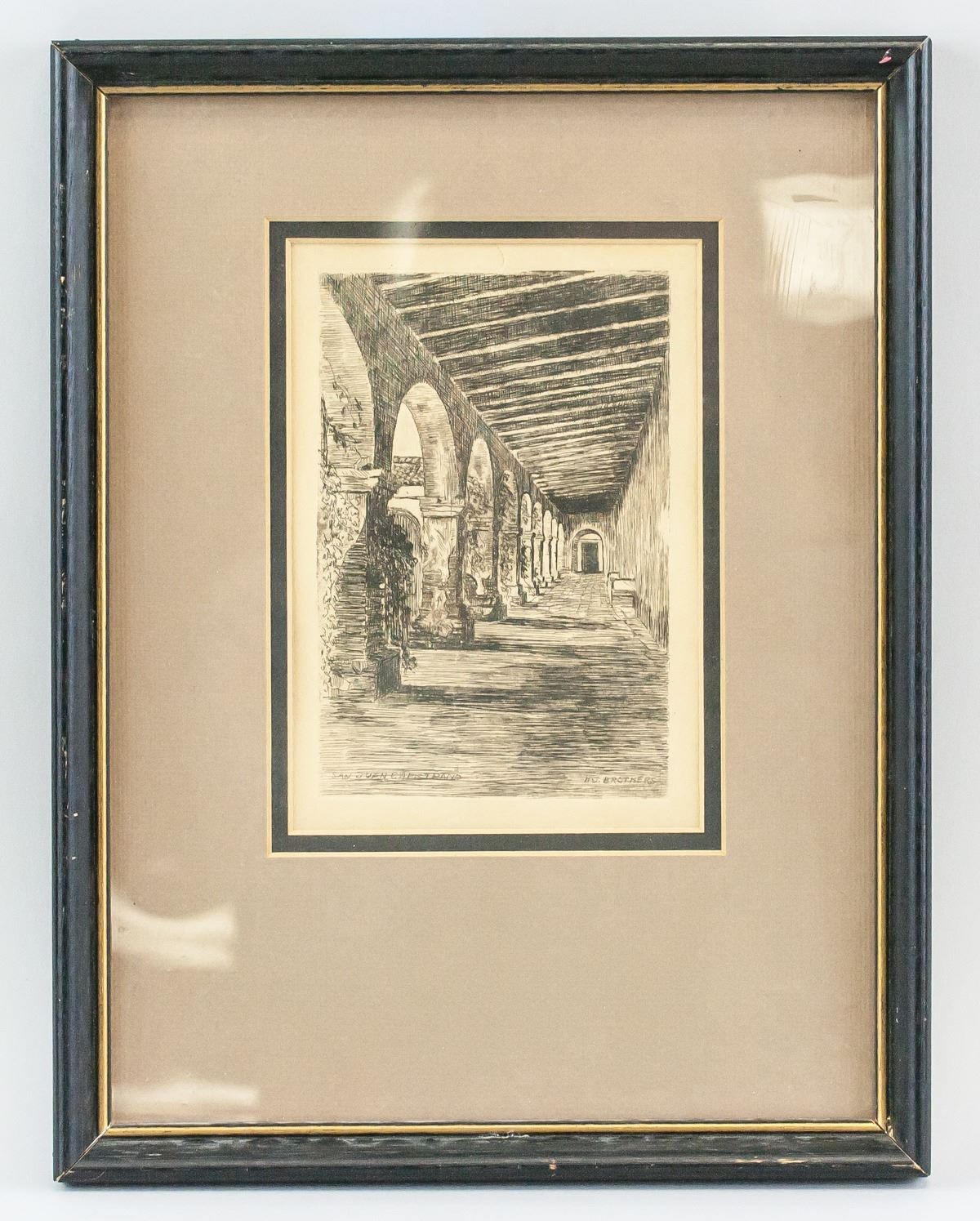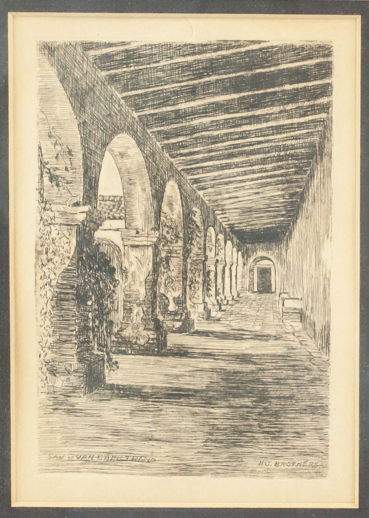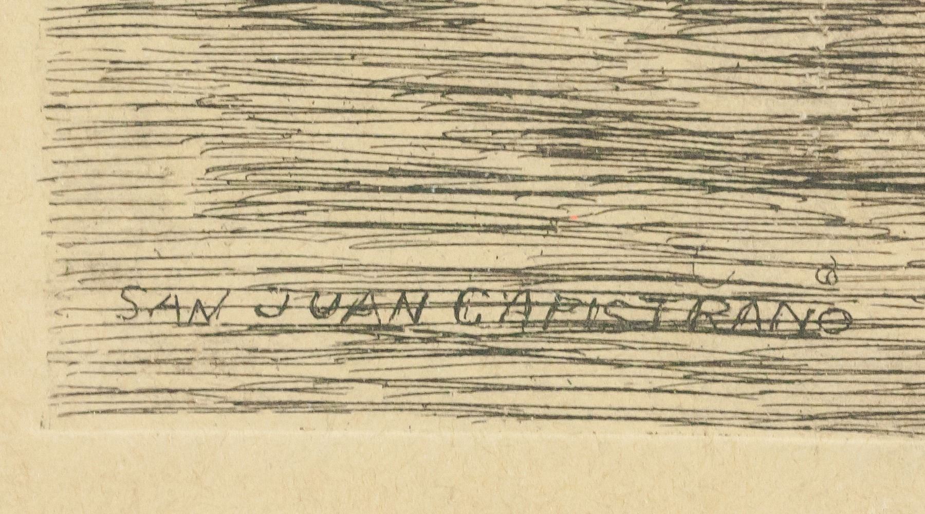 Print on paper, framed. Engraved print features Capistrano in San Juan. "San Juan Capistrano" printed in the bottom left corner. "H.J. Brothers" printed in the bottom right corner. Slight scratch on paper at the top. 17 x 12 cm (6.7 x 4.7 inches), framed: 33 x 25 cm (13 x 10 inches)