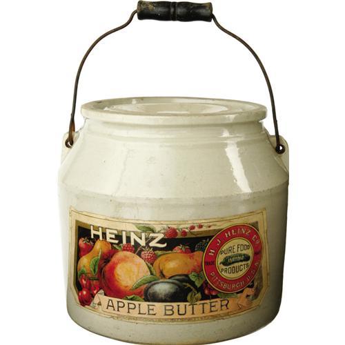 <B>H. J. Heinz Apple Butter Original Label Crock With Bail and Lid.</B></I> The bold graphics and color make this labeled crock an eye catching favorite. The size is just right, 7.5" tall, and the pottery is in good condition with only minor marks of imperfect firing and light crazing as you would expect. The label shows pears, peaches, cherries and the circular Heinz logo. Light edge wear to the label and some creases along with a few very light stains along the edges do not take away from its bright colors. This piece, from first glance, has the appearance of being very mint and has a classic graphic appeal.