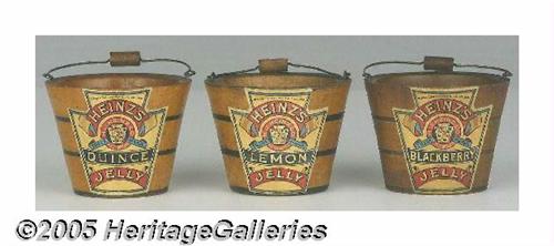 <B>H. J. Heinz Dated 1885 Three Wooden Jelly Buckets</B></I> 2 1/2" tall with colorful paper labels and keystone logo that Heinz has made so recognizable. Each held a different type of jelly; Quince, Lemon and Blackberry. The labels show minimal wear with minor nicks to the paper edges. Many have assumed that these could have been used for samples similar to the ones given out at the World's Fair in 1893 and 1904, but they could have just as easily been offered at the market to service wealthier buyers who preferred not to can their own. Each bucket still retains its original bail, making these very prized original containers. Lot:252