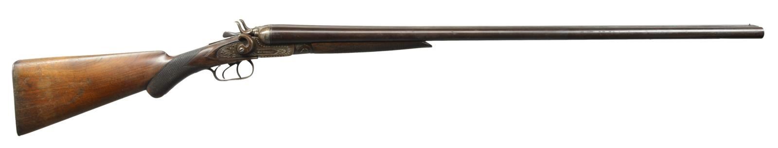 Cal. 12 Ga., 2 1/2". S# 1342. Bbls. 32 1/4" of "Belgium Fine Damascus" steel. Cyl. & Cyl. bores. Top lever exposed hammer action w/ dbl. triggers & extractors. Receiver, side plate & trigger guard have open pattern scroll engraving. Splinter forearm & rnd. knob walnut stock w/ checkered steel shotgun butt having hand checkering. CONDITION: metal finish is fading to gray brown showing scattered surface corrosion. Forearm shows wear w/ lg. chip along left bbl. channel. Stock is cracked at head w/ poor fit to action. Pitted bores. Locks have good function. (20-2492/DS). CURIO. $100-150.