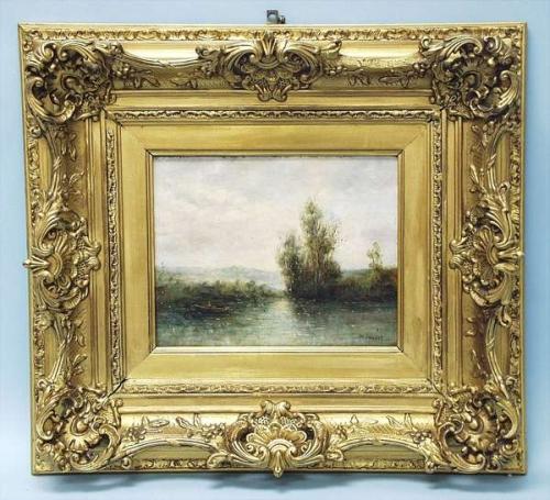H. JOUVET - 19th Century French School. "Riverscape with a Row Boat". Oil on wood panel. Signed lower right. 9" x 11 1/2". In gilt frame. 3500-4500