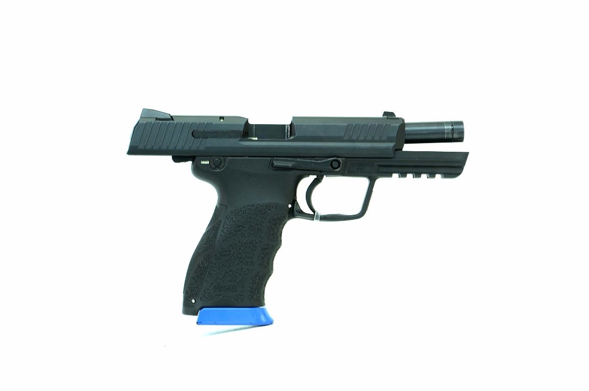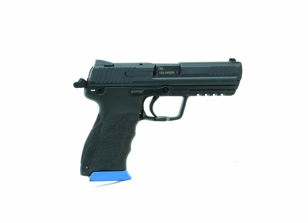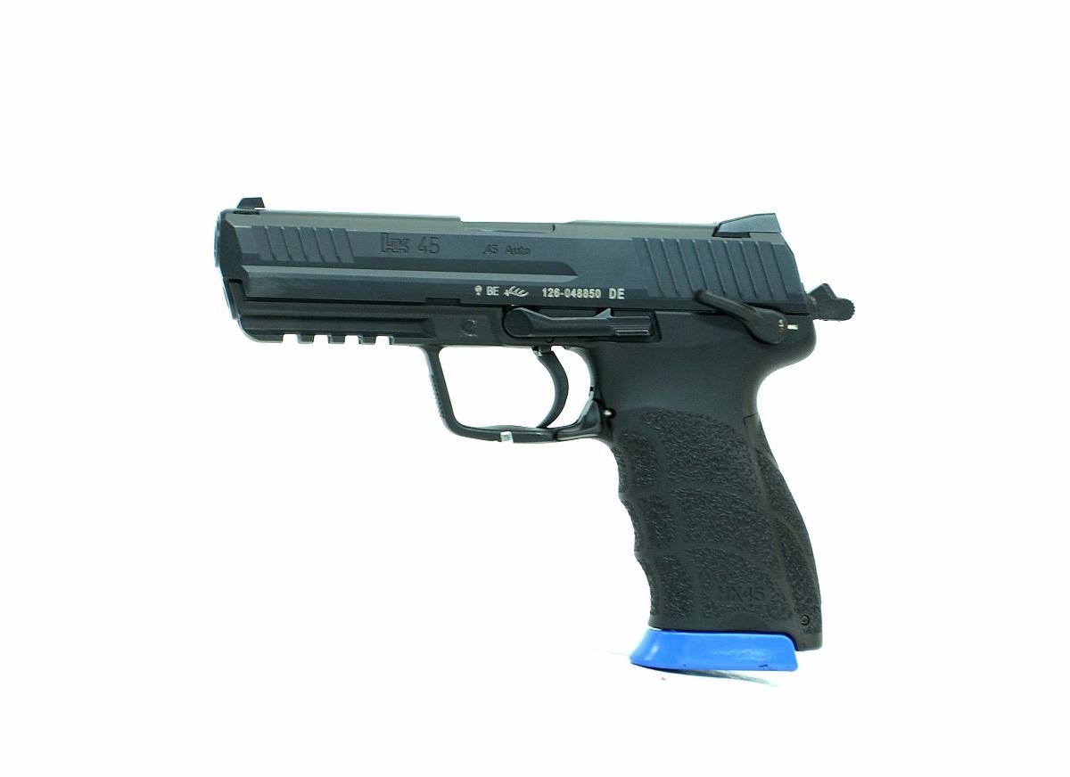 STOCK 2111HR-0090-G1, H & K - HK 45, 45 AUTO, DOUBLE ACTION SEMI AUTO HANDGUN, All MATTE BLACK FINISH,BLACK POLYMER FRAME WITH BOTTOM RAIL. STEEL TOP SLIDE WITH 3 DOT SIGHTS, AMBI GUN, SLIDE AND MAG RELEASE, DETACHABLE, MAGS (4), HARD CASE, VERY GOOD CONDITION 9/10, MADE IN THE U.S.A, SN 126048XXX