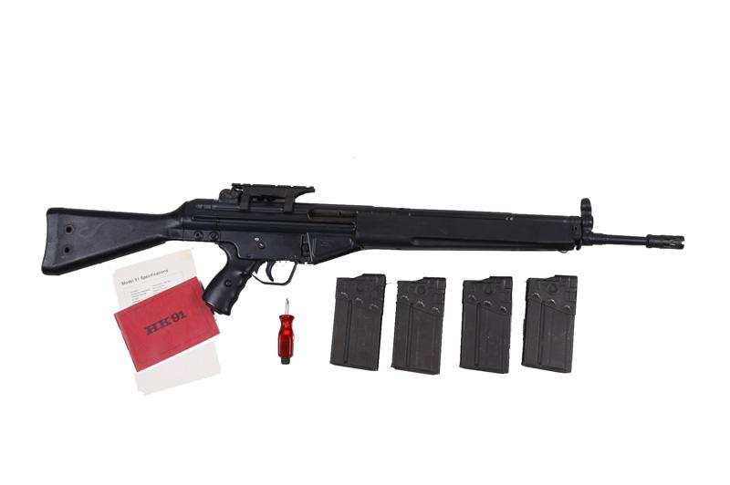 H&K Mdl 91 Cal .308 SN:A052662 Semi-auto sporting rifle made in Germany. Matte black finish, black polymer stock pistol grips and forearm, 18" barrel with flash hider, post and ring front sight and rotary rear sight. Good bore and action.