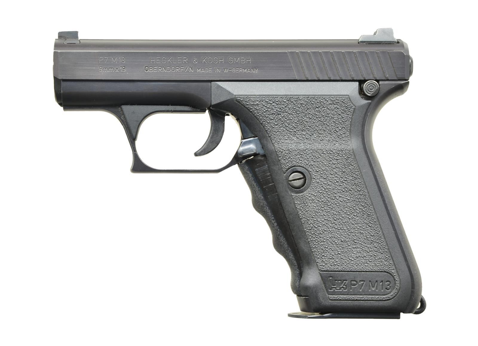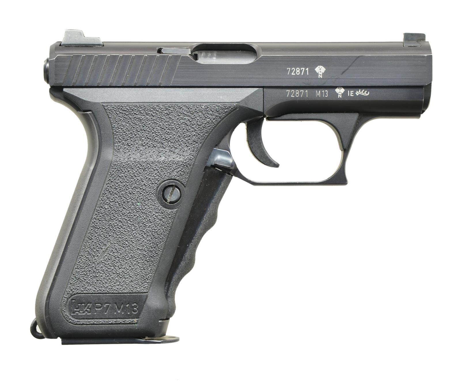 Cal. 9x19. S# 72871. Mfg. 1984. Bbl. 4" with polygonal rifling. Unique squeeze cocking single action only pistol. Fixed 3 dot low profile sights. Ambidextrous mag release. Extended triggerguard with heat shield. Stippled black plastic grips. Black phosphate finish. Similar to the M8, however utilizes a 13 rd. staggered mag. MAGS: 2 - 13 rd. mags. CONDITION: overall very fine with only a few extremely minor handling marks, otherwise a very attractive pistol. Bright shiny bore. (22-5488/ZAL). MODERN. $2,000-3,000.