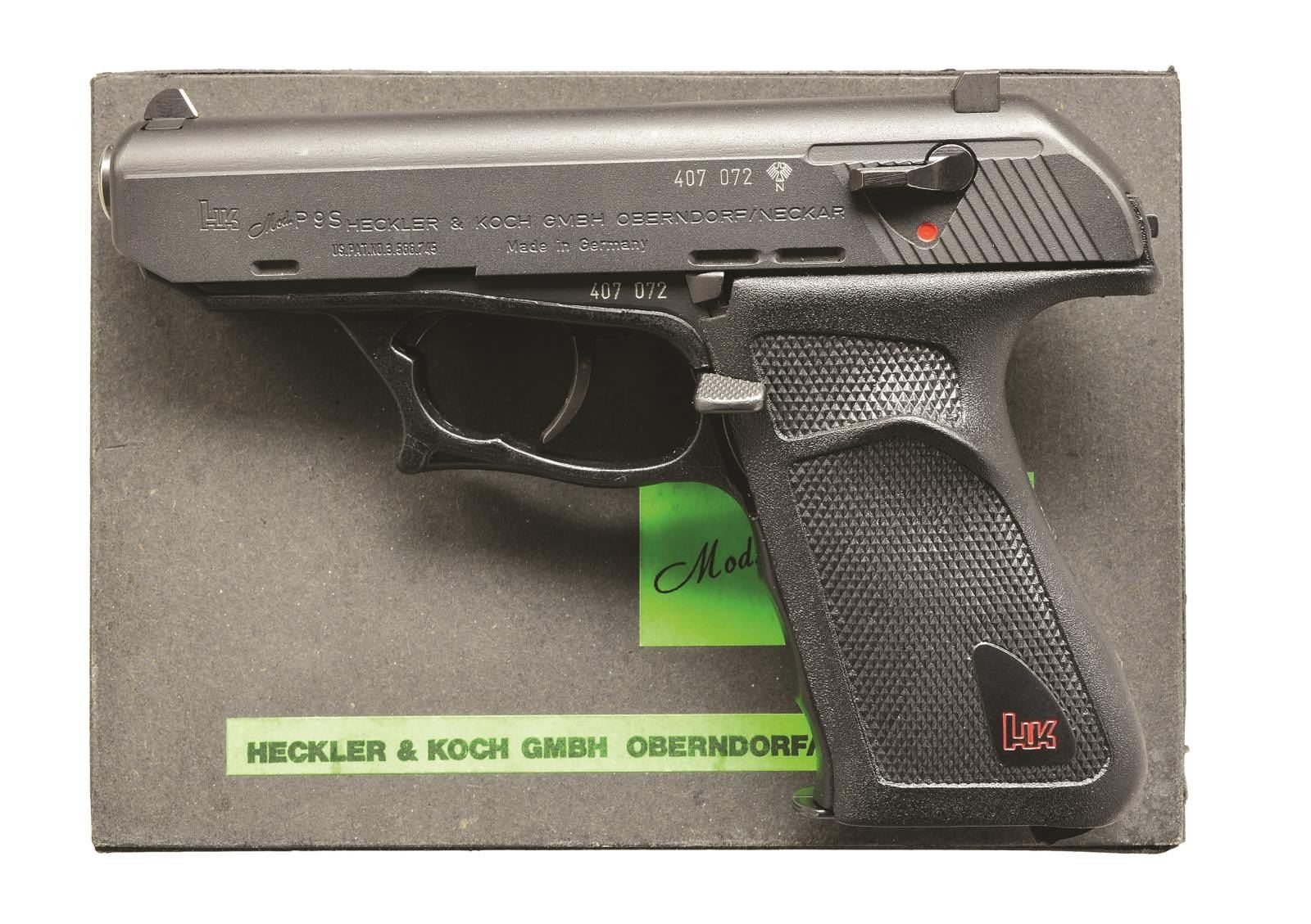 Cal. 45 ACP. S# 407072. Bbl. 4" w/ phosphate finish. Plastic grips, bottom release mag. Right side of slide marked “HK CHANTALLY, VA”. MAGS:2. UNATTACHED ACCESSORIES: black cardboard box w/ label on top numbered to this pistol. 1 Spare mag. still in plastic wrapper. CONDITION: very fine, appears little used w/ a few minor marks in metal finish. Bright, shiny bore. (21-1680/MGM). MODERN. $800-1,200.