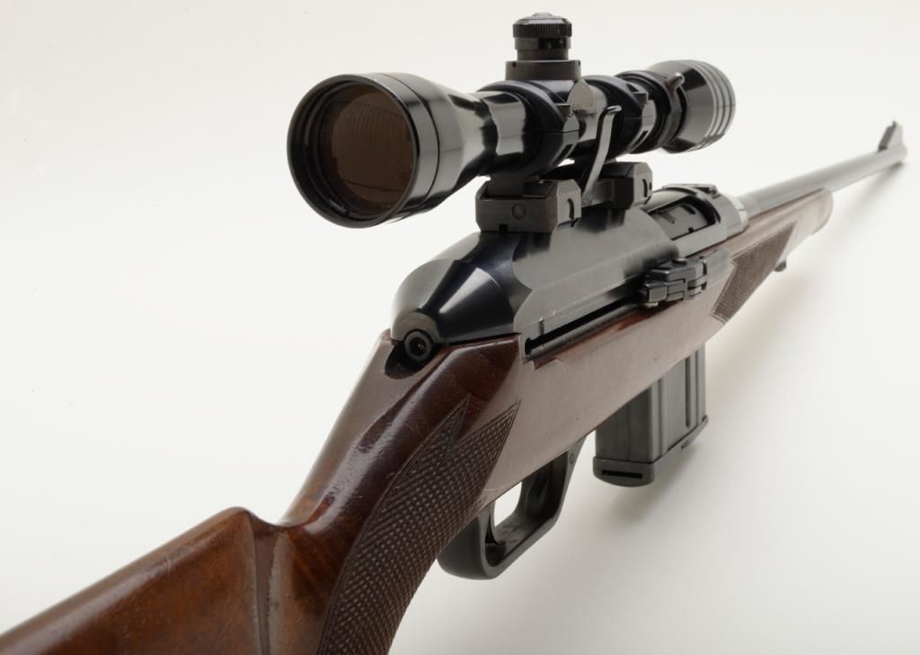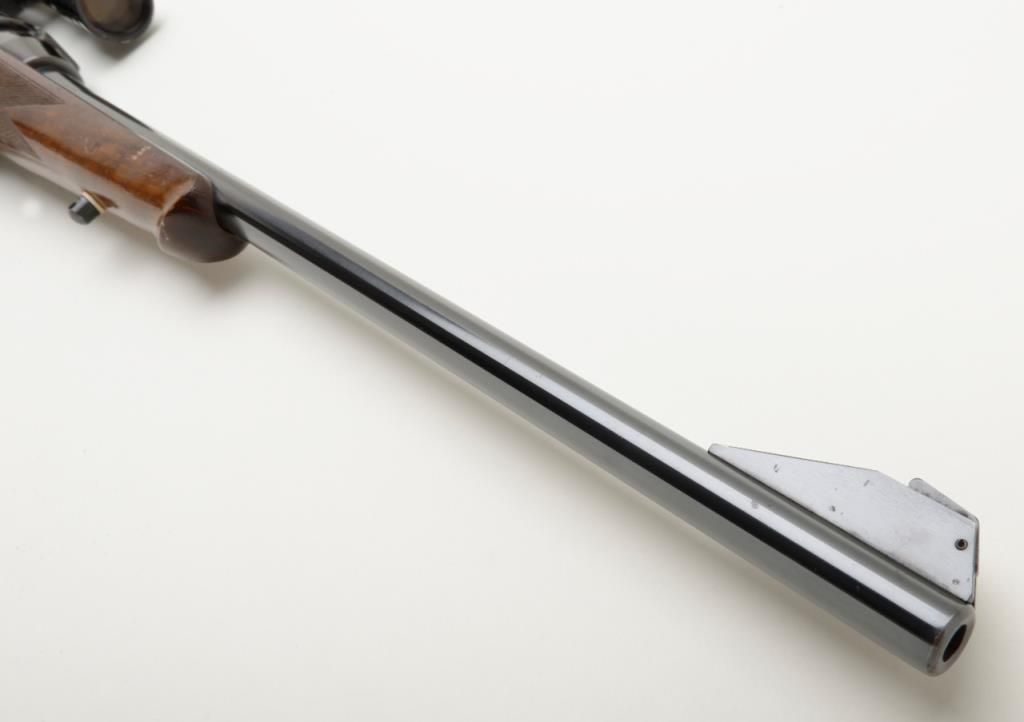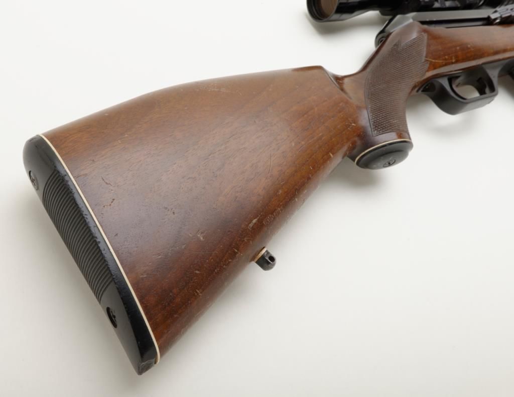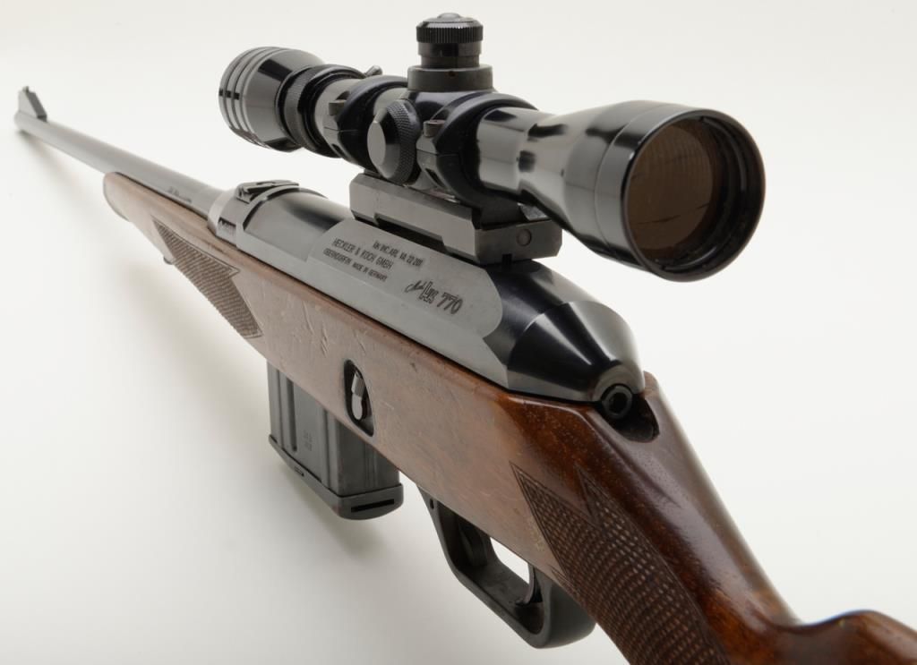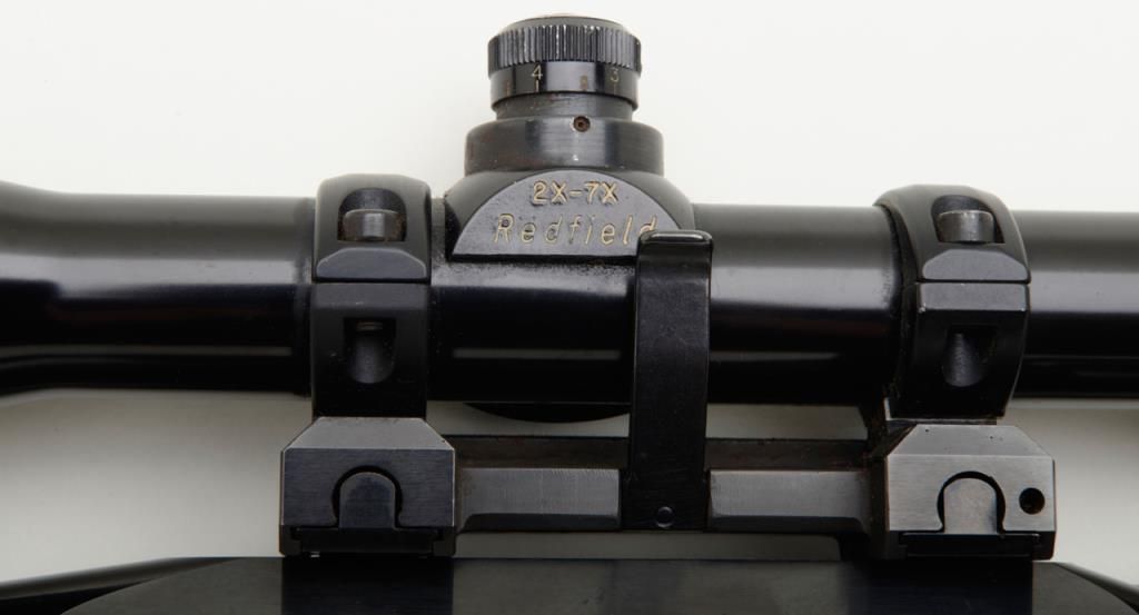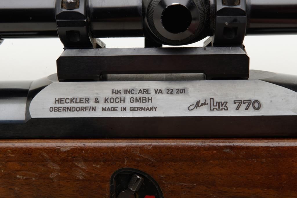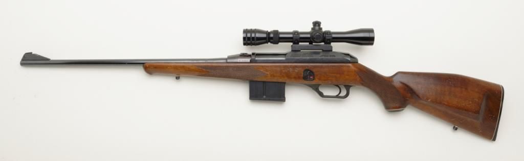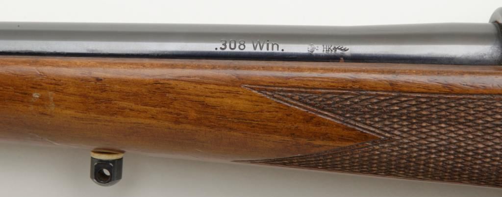 H & K model 770 semiautomatic sporting rifle in .308 Winchester caliber mounted with 2x7 power Redfield scope and quick detachable European type finger release mounts. The rifle shows some toning and even blue wear about 75% to 85% blue. The stock shows many small scratches, mars from handling and use and is good to very good overall. The action is good and the bore is very good. These H & K sporting rifles are very high quality and desirable in this caliber. Est.: $600-$1200