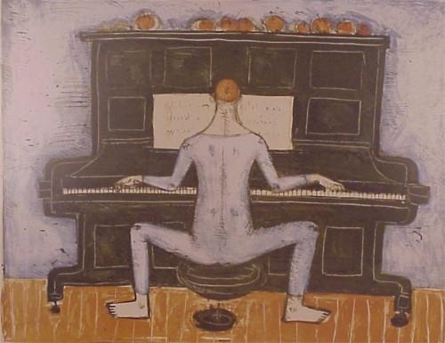 H. Kohler (20th Century) MAN AT THE PIANO, color lithograph, signed in pencil, from the numbered edition 150, 17 1/2 x 22", full margins, framed with glass, some small foxing speckles.