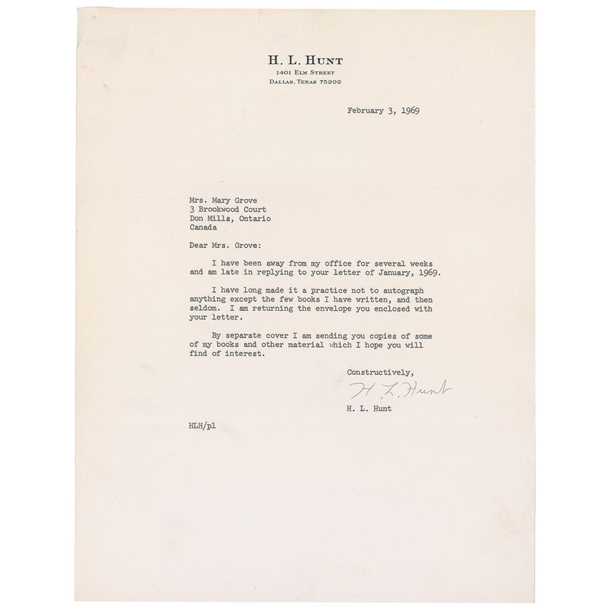 American oil tycoon (1889-1974), Hunt built his oil dynasty by trading poker winnings for oil rights, eventually owning a vast majority of the East Texas Oil Field. At the time of his death, he held the title of wealthiest person, worldwide, and his three wives and many offspring were the inspiration for the wildly popular show, Dallas, which ran from 1978–1991. TLS, one page, 8.5 x 11, personal letterhead, February 3, 1969. In a brief response to an autograph request, Hunt responds, in full: “I have been away from my office for several weeks and am late in replying to your letter of January, 1969. I have long made it a practice not to autograph anything except a few books I have written, and then seldom. I am returning the envelope you enclosed with your letter. By separate cover I am sending you copies of some of my books and other material which I hope you will find of interest.” In fine condition, with some light creasing at the edges and top left corner, along with a few trivial spots of soiling at the same corner.