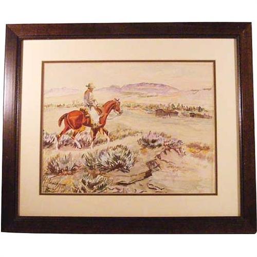 Framed HL Litzinger watercolor with brand depicting a cowboy heading home. Image size is 13.5'' x 10.25''
