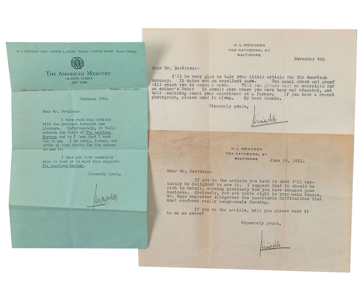 Three TLSs to a farmer with journalistic aspirations, each one page, two on personal letterhead and one on The American Mercury letterhead, all circa 1931. One letter, in part: “If you do the article you have in mind I’ll certainly be delighted to see it…it should be rich in detail, showing precisely how you have managed your business…Mr. Mayo neglected altogether the inevitable difficulties that must confront really large-scale farming.” Another, in part: “I’ll be very glad to take your little article…Will you please send me materials for an Author’s Note?” Overall soiling to one letter, otherwise overall fine condition. Accompanied by the original mailing envelope for one letter. Davidson’s article was published in the February 1932 issue of The American Mercury, under the title ‘The Case Against Large-Scale Farming.’