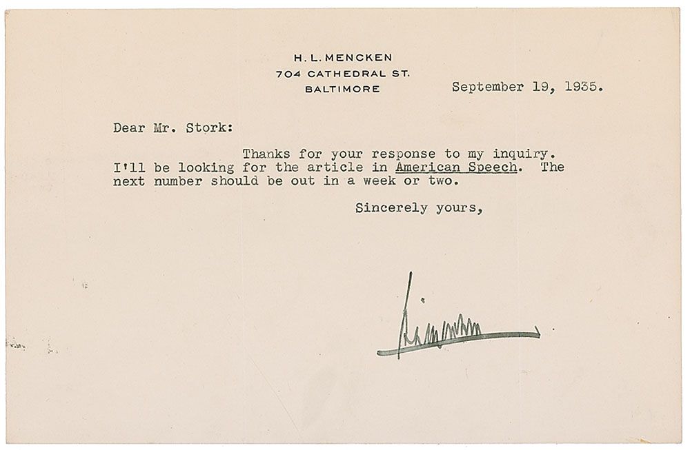 Popular and influential American author and journalist (1880–1956) best known for his satirical pieces that took aim at contemporary American society. TLS, one page, 8.5 x 5.5, personal letterhead, September 19, 1935. Short letter in response to an inquiry. In full: “Thanks for your response to my inquiry. I’ll be looking for the article in American Speech. The next number should be out in a week or two.” In fine condition, with two vertical folds, and a bit of light soiling to left edge.