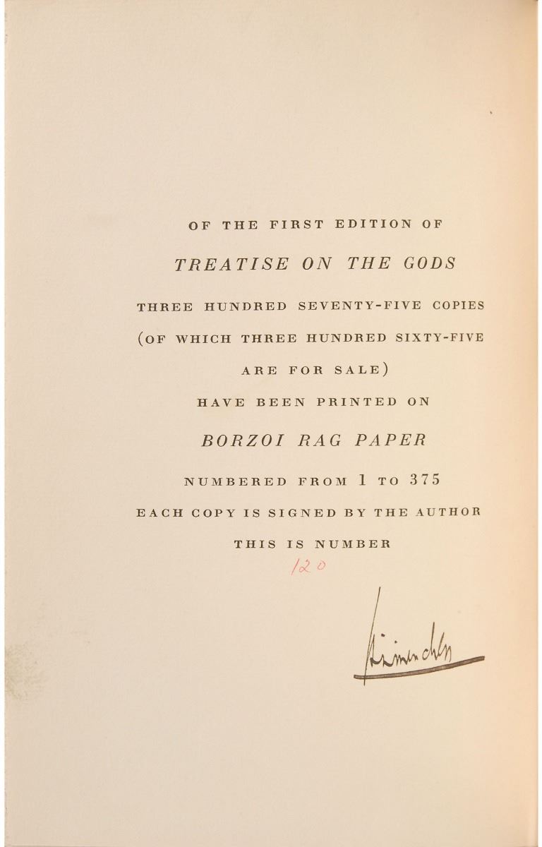 Signed book: Treatise on the Gods. First edition, limited issue, numbered 120/375. NY: Alfred A. Knopf, 1930. Hardcover with wooden slipcase, 6.25 x 9.5, 364 pages. Neatly signed on the colophon in fountain pen. Autographic condition: fine. Book condition: VG-/VG, with sunning and soiling to spine.