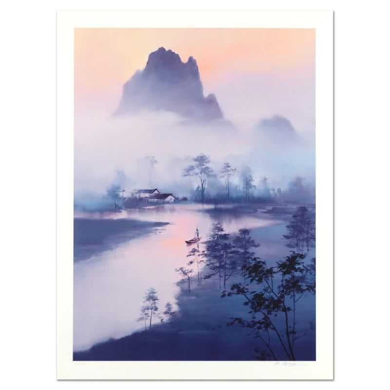 "Li River Morning" is a limited edition giclee on paper by H. Leung, numbered and hand signed by the artist. Includes Letter of Authenticity. Measures approx. 30" x 39.5" (border), 26" x 35" (image).