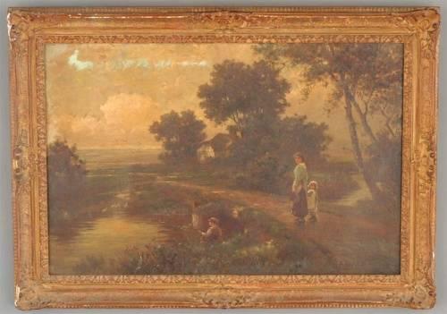 1 H. MARTIN 20"x30" o/c Fishing On The River Bank signed lr, dirty estimate 500-800