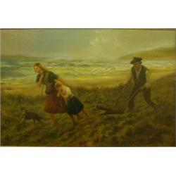 H*** MacCallum, a Scottish family ploughing by the coast, signed, oil on canvas, 50 x 75 cm