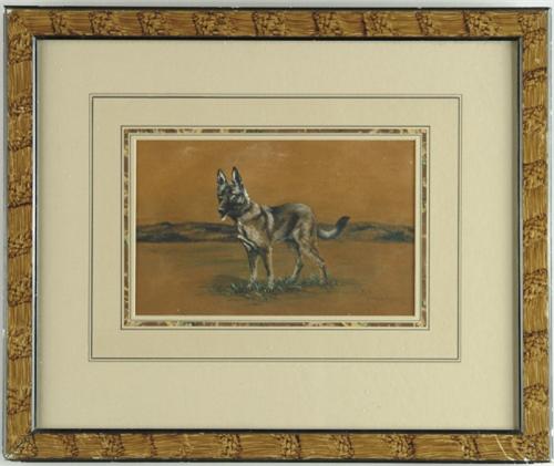 H. NEWMAN (20th Century) ""KIM"". Watercolor/gouache on brown paper depicts a German Shepherd type dog standing on grass with low hills in background. Signed and titled lower right. Sponge decorated frame with fancy watercolor matte. SIGHT SIZE: 6in. x 9-1/2in.. CONDITION: Very good. 9-95453