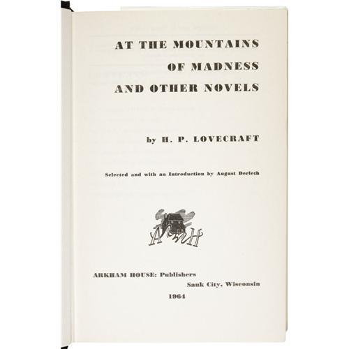 <B>H. P. Lovecraft:<I> At the Mountains of Madness and Other Novels</B></I>.</B></I> (Sauk City: Arkham House, 1964), first edition, first printing (no headband, "Three thousand copies of this book have been printed…" on page 433 ), 432 pages, jacket design by Lee Brown Coye, black cloth with gilt titles, 8vo (5.5" x 8.25"), fine in a near fine slightly toned unclipped jacket. <I>From the Ventura Collection.</B></I><BR><BR><b>Shipping:</b> Books & Catalogs (<a target="_blank" href="http://www.heritageauctions.com/common/shipping.php">view shipping information</a>)