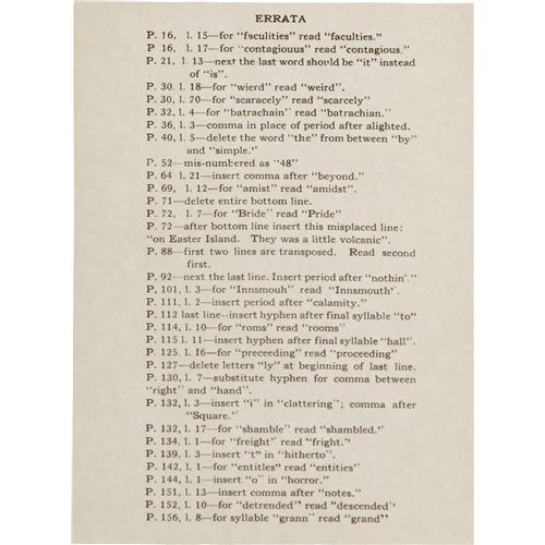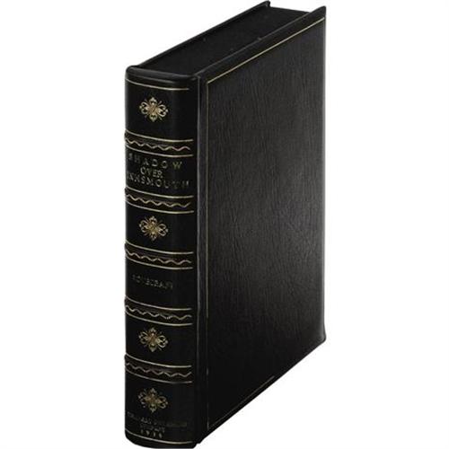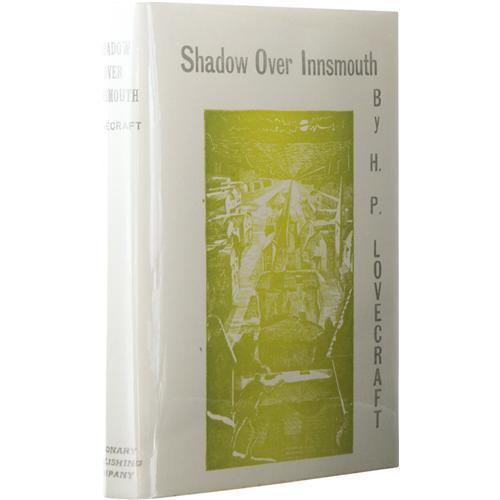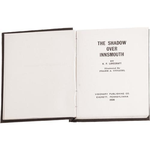 <B>H. P. Lovecraft:<I> Shadow Over Innsmouth.</B></I></B></I> (Everett: Visionary Publishing Company, 1936), first edition, 158 pages, four illustrations by Frank A. Utpatel, original black cloth with silver titles, 12mo (5.25" x 7.25"), with rare dust jacket variant on white paper with silver lettering on the front panel and spine matching that from the cloth binding, with no illustration. The second variant dust jacket with illustration is also included. The copy at hand has the lettering on the cover in upper and lower case letters, one of two known bindings with no priority established. According to publisher William H. Crawford, of the approximately 400 copies printed, about 200 copies were bound with the rest destroyed at a later date. Also according to the publisher, the printed dust jacket and errata slip were prepared after publication both of which are present with this copy. A few small areas of cloth slightly soiled, else a fine, bright copy with two crisp, bright dust jackets. This copy comes housed in an attractive black leather slipcase with gilt lettering on the banded-leather spine. A key title to any collection of fantasy, horror, and supernatural fiction. <I>From the Ventura Collection.</B></I><BR><BR><b>Shipping:</b> Books & Catalogs (<a target="_blank" href="http://www.heritageauctions.com/common/shipping.php">view shipping information</a>)