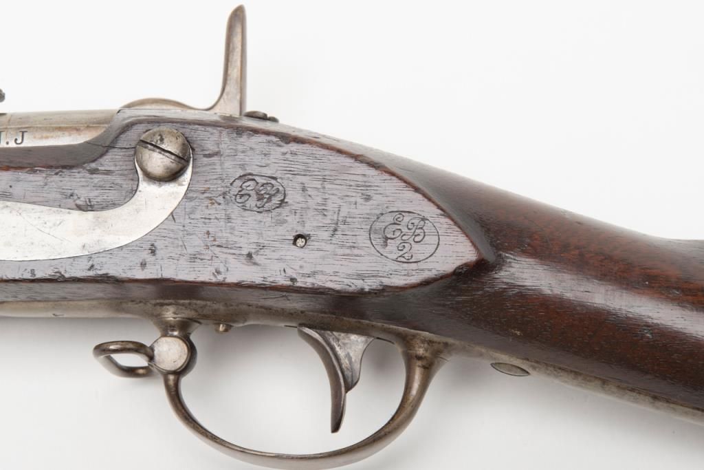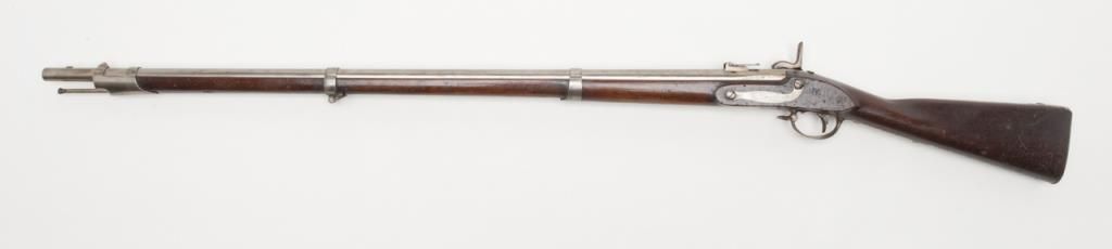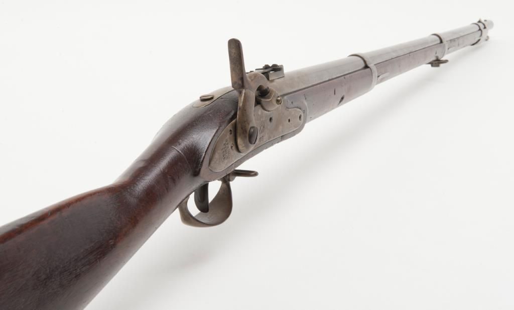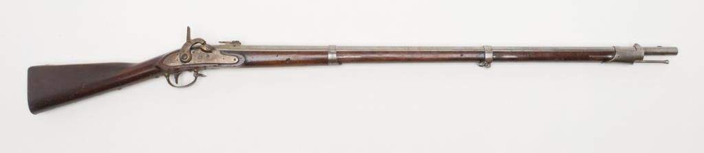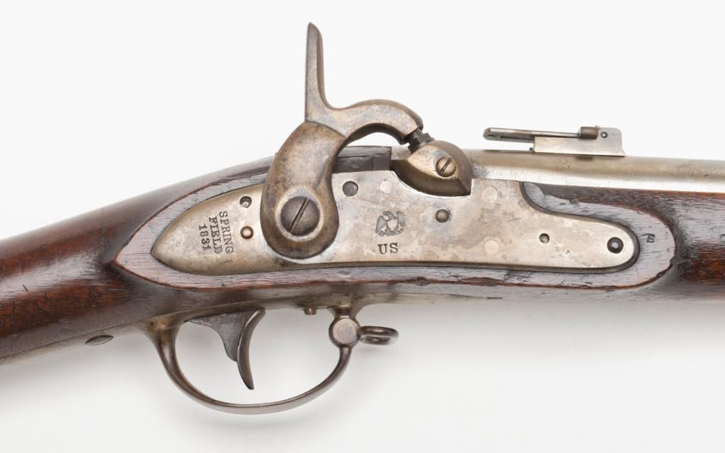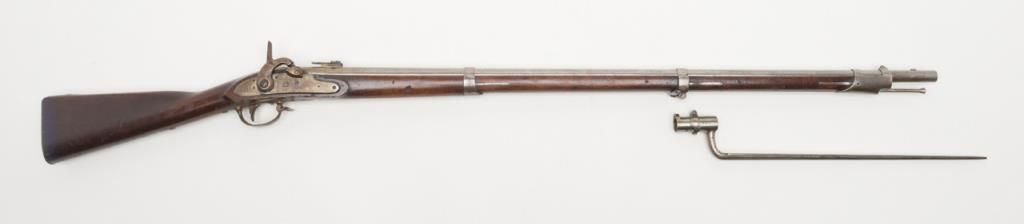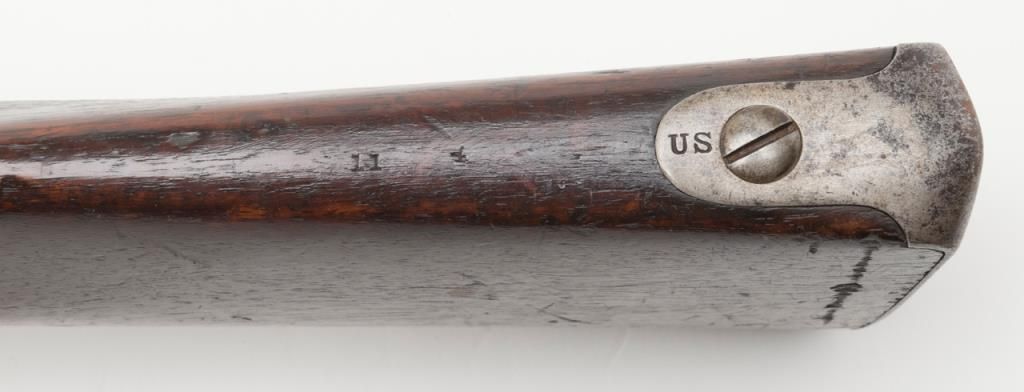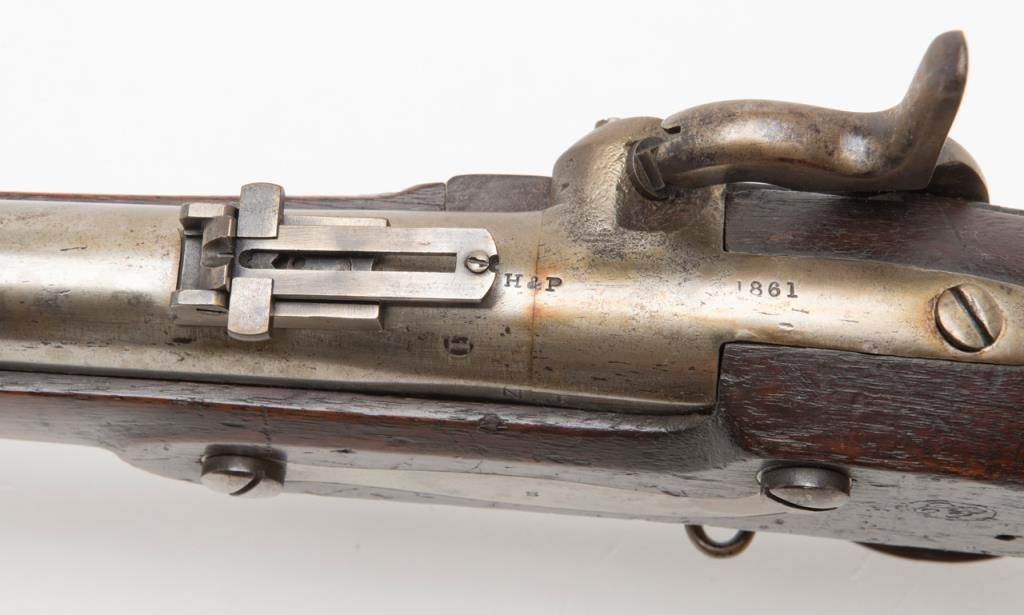 H & P conversion of flintlock musket to percussion with rifle sights and update for Civil War dated 1861 at the breech. The metal surfaces show a light gray patina with some minor erosion and scattered pinprick pitting. The lock shows goodEagle, U.S. with Springfield and 1831. A period bayonet and ramrod are included. The rifling is good. The stock is also very good with two clear cartouches, some minor dings, mars and just normal aging. The action works well. An above averageexample of an early Civil War issued arm. Est.: $1400-$2800