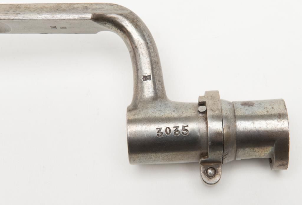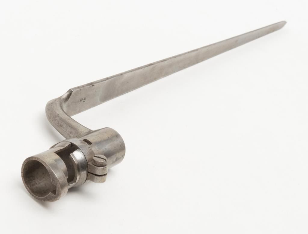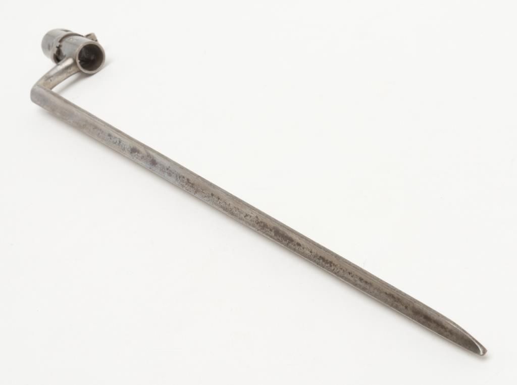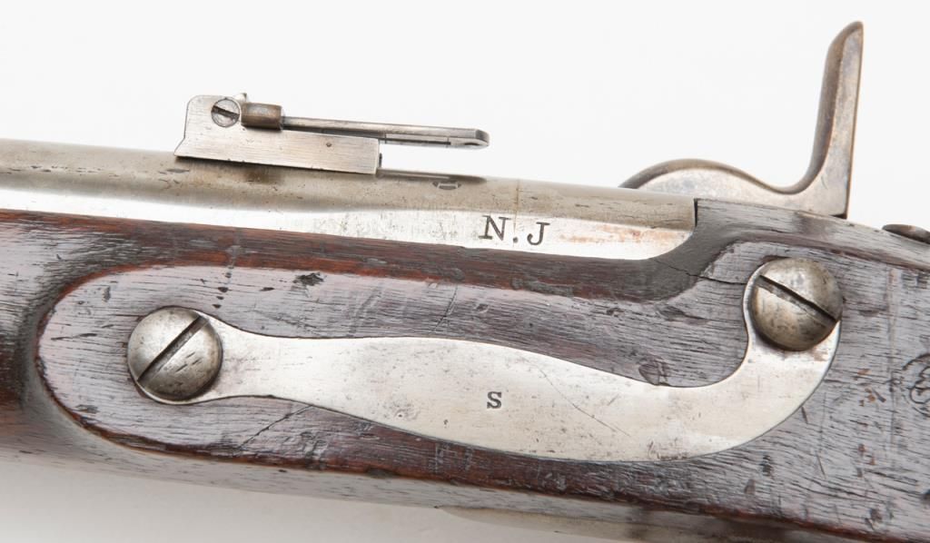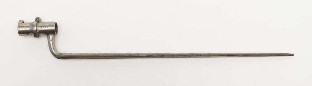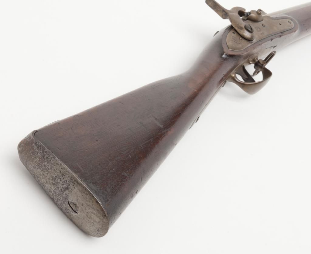 H & P conversion of flintlock musket to percussion with rifle sights and update for Civil War dated 1861 at the breech. The metal surfaces show a light gray patina with some minor erosion and scattered pinprick pitting. The lock shows goodEagle, U.S. with Springfield and 1831. A period bayonet and ramrod are included. The rifling is good. The stock is also very good with two clear cartouches, some minor dings, mars and just normal aging. The action works well. An above averageexample of an early Civil War issued arm. Est.: $1400-$2800