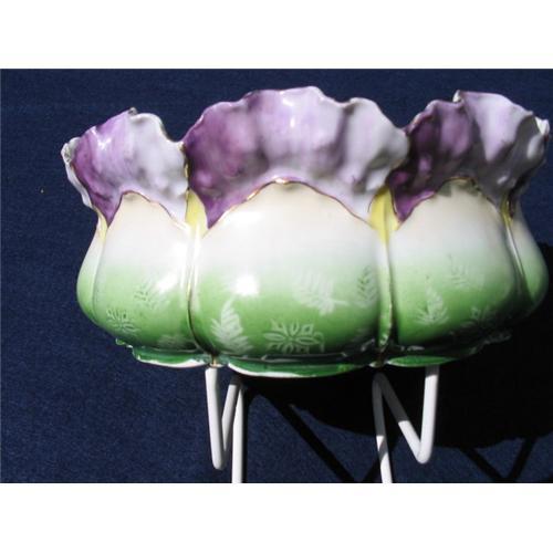 HERE IS A BEAUTIFUL HAND PAINTED R S PRUSSIA (UNMARKED) FERNER. IT MEASURES 8.75" IN DIAMETER AND IS 3.75" HIGH. THIS LOVELY PIECE IS DELICATE IN THE R S PRUSSIA TRADITION AND IS HANDSOMELY DECORATED IN GREEN, YELLOW AND VIOLET WITH GOLD TRIM. THE CONDITION IS VERY GOOD WITH ONLY A SMALL AMOUNT OF GOLD WEAR. THERE ARE NO CHIPS CRACKS OR REPAIRS.