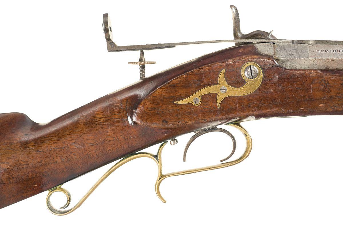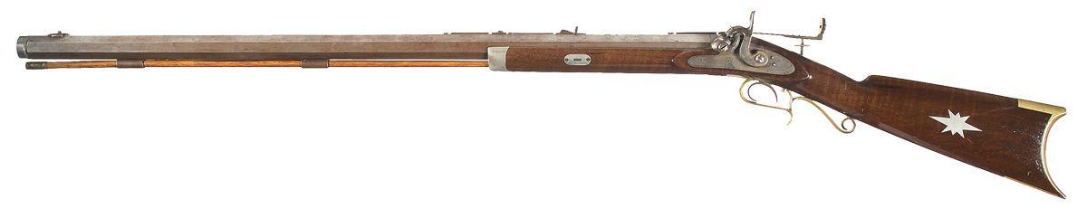Made in the mid-19th Century. Left handed, with tang peep sight, standard markings, brass tipped ramrod and a silver inlaid star on the buttstock. Mechanically needs work.